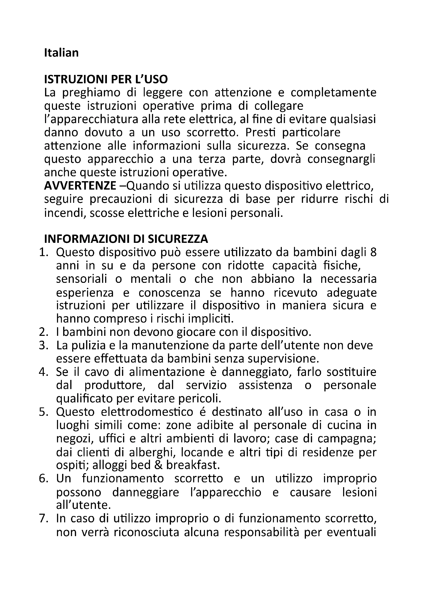 La preghiamo di leggere con attenzione e completamente queste istruzioni operative prima di collegare l’apparecchiatura alla rete elettrica, al fine di evitare qualsiasi danno dovuto a un uso scorretto. Presti particolare attenzione alle informazioni sulla sicurezza. Se consegna questo apparecchio a una terza parte, dovrà consegnargli anche queste istruzioni operative. AVVERTENZE –Quando si utilizza questo dispositivo elettrico, seguire precauzioni di sicurezza di base per ridurre rischi di incendi, scosse elettriche e lesioni personali.