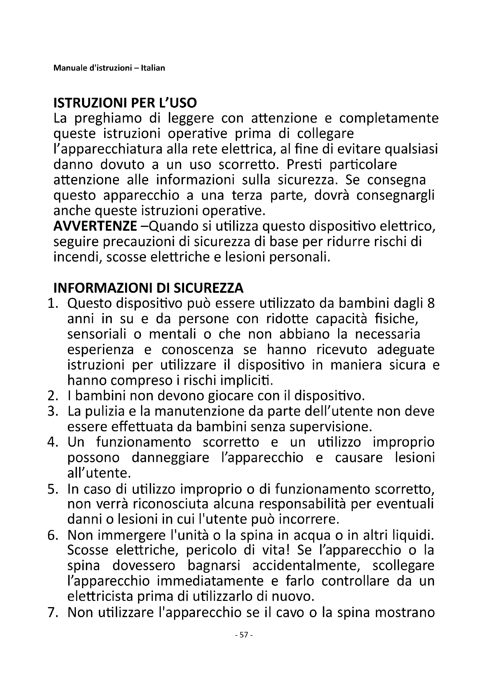 7. Non utilizzare l'apparecchio se il cavo o la spina mostrano- 58 -