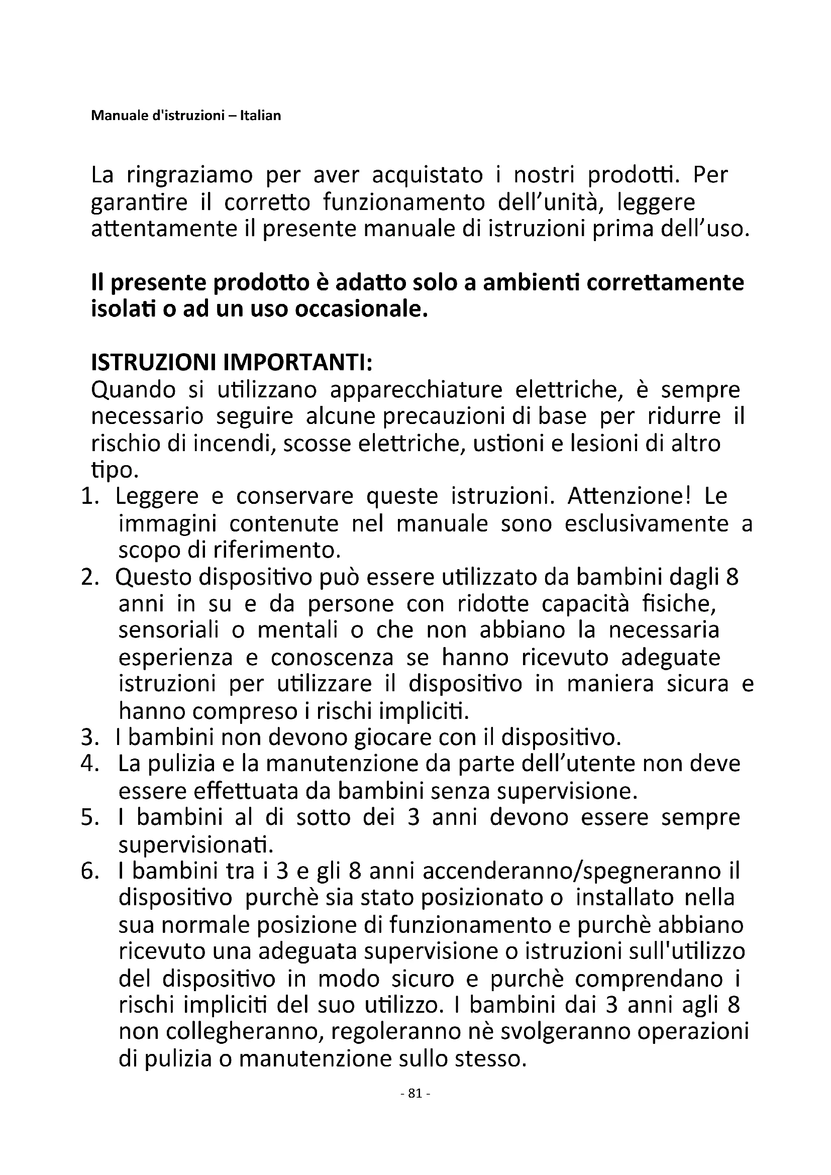 dispositivo purchè sia stato posizionato o installato nella sua normale posizione di funzionamento e purchè abbiano ricevuto una adeguata supervisione o istruzioni sull'utilizzo del dispositivo in modo sicuro e purchè comprendano i rischi impliciti del suo utilizzo. I bambini dai 3 anni agli 8 non collegheranno, regoleranno nè svolgeranno operazioni di pulizia o manutenzione sullo stesso.- 82 -