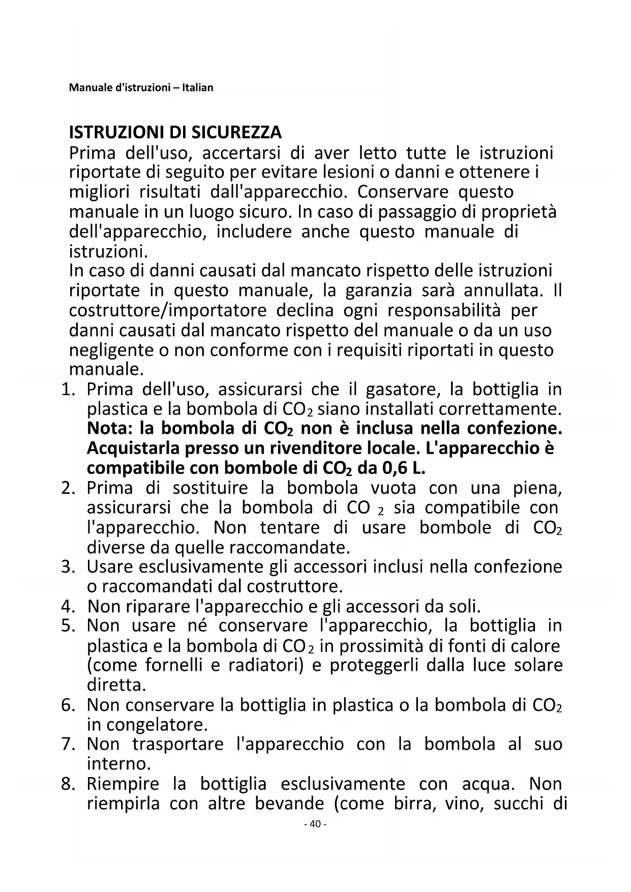 6. Non conservare la bottiglia in plastica o la bombola di CO