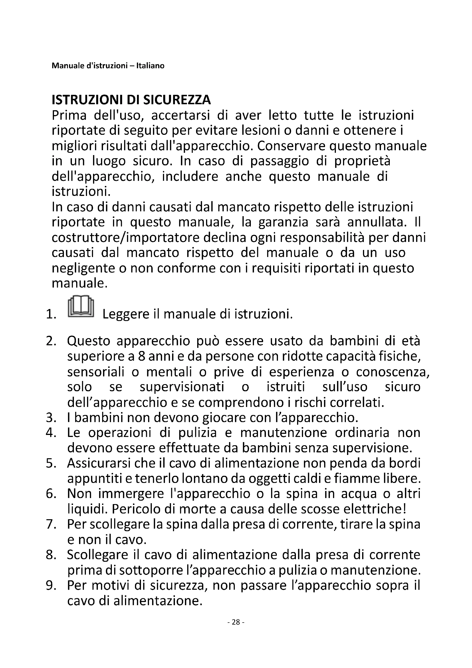 Prima dell'uso, accertarsi di aver letto tutte le istruzioni riportate di seguito per evitare lesioni o danni e ottenere i migliori risultati dall'apparecchio. Conservare questo manuale in un luogo sicuro. In caso di passaggio di proprietà dell'apparecchio, includere anche questo manuale di istruzioni. In caso di danni causati dal mancato rispetto delle istruzioni riportate in questo manuale, la garanzia sarà annullata. Il costruttore/importatore declina ogni responsabilità per danni causati dal mancato rispetto del manuale o da un uso negligente o non conforme con i requisiti riportati in questo manuale.