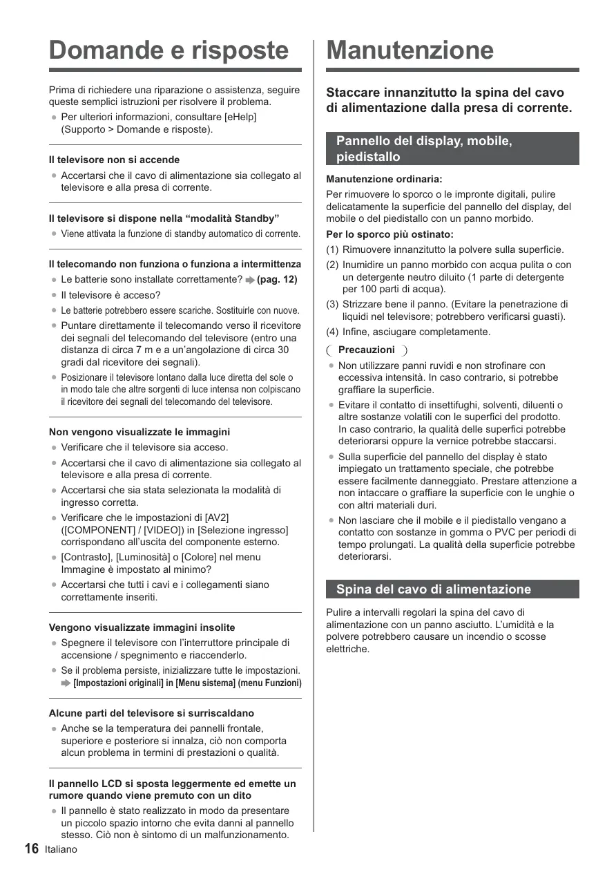 Il telecomando non funziona o funziona a intermittenza Le batterie sono installate correttamente? (pag. 12) Il televisore è acceso? Le batterie potrebbero essere scariche. Sostituirle con nuove. Puntare direttamente il telecomando verso il ricevitore dei segnali del telecomando del televisore (entro una distanza di circa 7 m e a un’angolazione di circa 30 gradi dal ricevitore dei segnali). Posizionare il televisore lontano dalla luce diretta del sole o in modo tale che altre sorgenti di luce intensa non colpiscano il ricevitore dei segnali del telecomando del televisore. Non vengono visualizzate le immagini Verificare che il televisore sia acceso. Accertarsi che il cavo di alimentazione sia collegato al televisore e alla presa di corrente. Accertarsi che sia stata selezionata la modalità di ingresso corretta. Verificare che le impostazioni di [AV2] ([COMPONENT] / [VIDEO]) in [Selezione ingresso] corrispondano all’uscita del componente esterno. [Contrasto], [Luminosità] o [Colore] nel menu Immagine è impostato al minimo? Accertarsi che tutti i cavi e i collegamenti siano correttamente inseriti. Vengono visualizzate immagini insolite Spegnere il televisore con l’interruttore principale di accensione / spegnimento e riaccenderlo. Se il problema persiste, inizializzare tutte le impostazioni. [Impostazioni originali] in [Menu sistema] (menu Funzioni) Alcune parti del televisore si surriscaldano Anche se la temperatura dei pannelli frontale, superiore e posteriore si innalza, ciò non comporta alcun problema in termini di prestazioni o qualità.