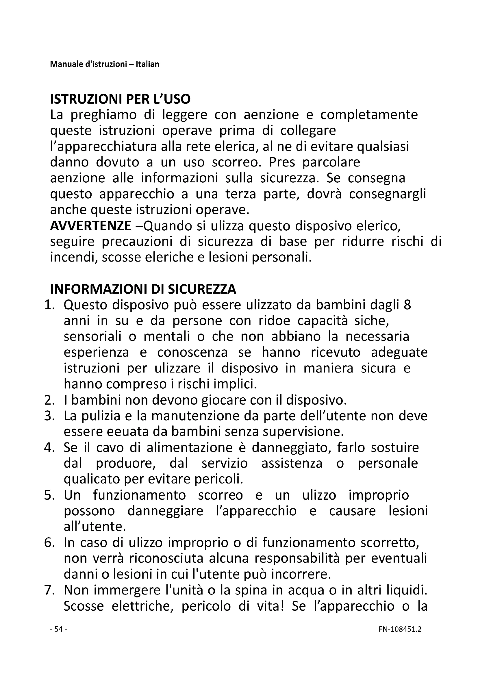 Scosse elettriche, pericolo di vita! Se l’apparecchio o la- 55 - FN-108451.2 spina dovessero bagnarsi accidentalmente, scollegare l’apparecchio immediatamente e farlo controllare da un elettricista prima di utilizzarlo di nuovo.