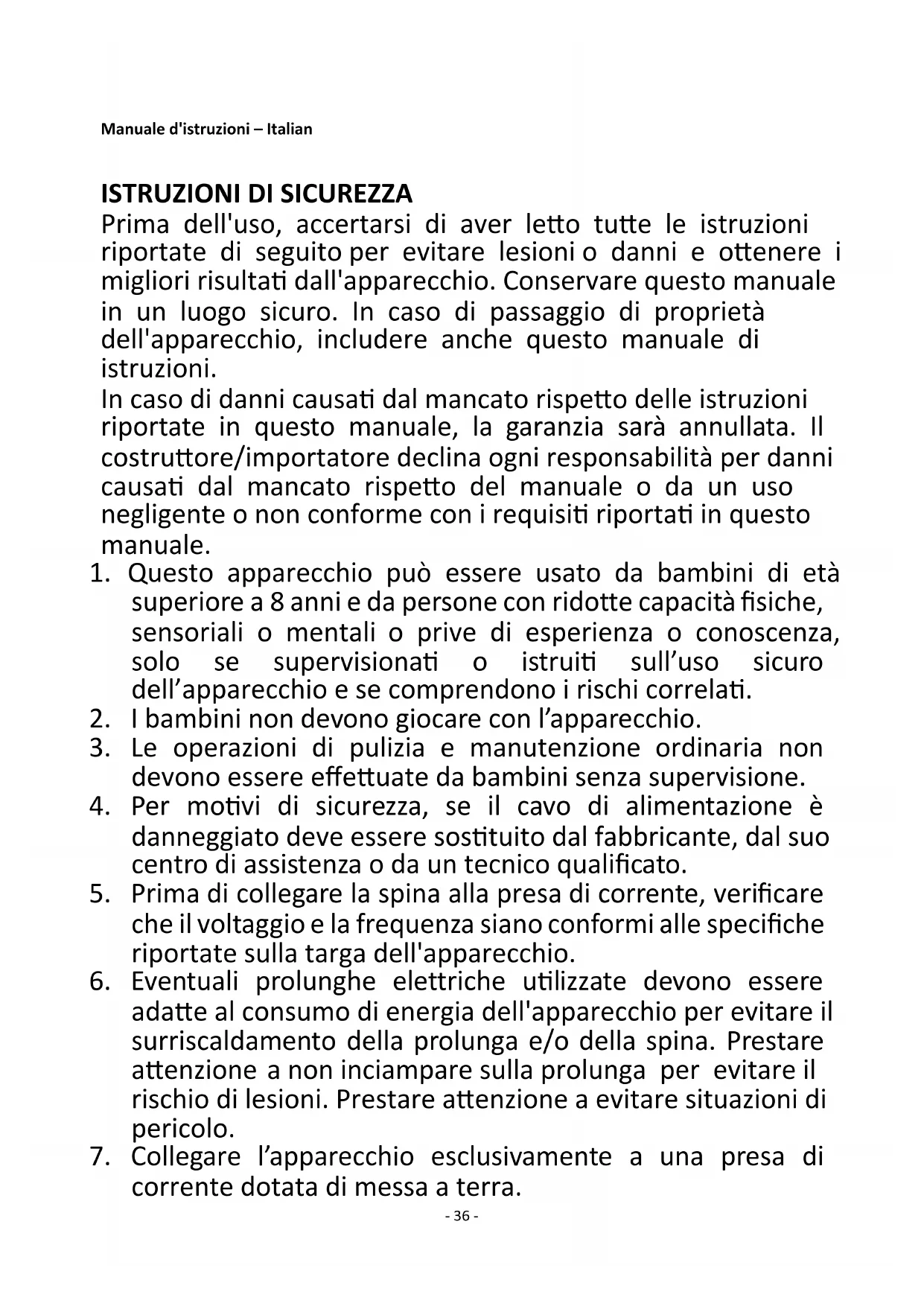 Prima dell'uso, accertarsi di aver letto tutte le istruzioni riportate di seguito per evitare lesioni o danni e ottenere i migliori risultati dall'apparecchio. Conservare questo manuale in un luogo sicuro. In caso di passaggio di proprietà dell'apparecchio, includere anche questo manuale di istruzioni. In caso di danni causati dal mancato rispetto delle istruzioni riportate in questo manuale, la garanzia sarà annullata. Il costruttore/importatore declina ogni responsabilità per danni causati dal mancato rispetto del manuale o da un uso negligente o non conforme con i requisiti riportati in questo manuale.
