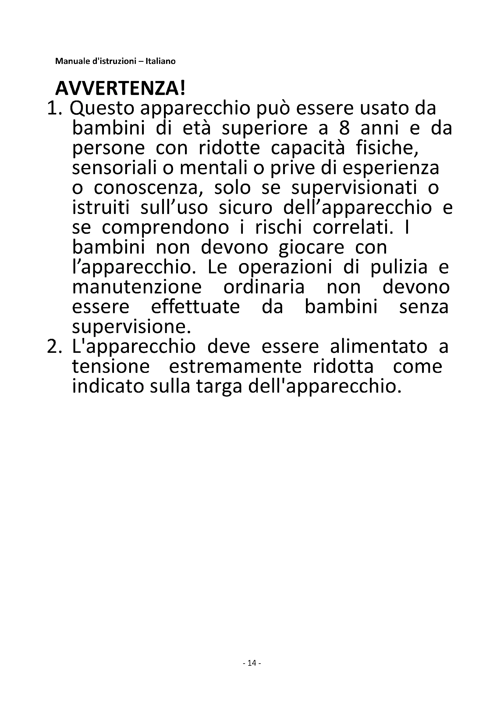 bambini di età superiore a 8 anni e da persone con ridotte capacità fisiche, sensoriali o mentali o prive di esperienza o conoscenza, solo se supervisionati o istruiti sull’uso sicuro dell’apparecchio e se comprendono i rischi correlati. I bambini non devono giocare con l’apparecchio. Le operazioni di pulizia e manutenzione ordinaria non devono essere effettuate da bambini senza supervisione.
