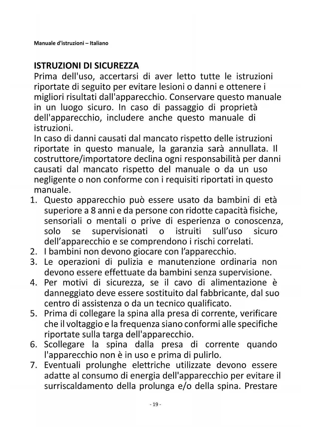 Prima dell'uso, accertarsi di aver letto tutte le istruzioni riportate di seguito per evitare lesioni o danni e ottenere i migliori risultati dall'apparecchio. Conservare questo manuale in un luogo sicuro. In caso di passaggio di proprietà dell'apparecchio, includere anche questo manuale di istruzioni. In caso di danni causati dal mancato rispetto delle istruzioni riportate in questo manuale, la garanzia sarà annullata. Il costruttore/importatore declina ogni responsabilità per danni causati dal mancato rispetto del manuale o da un uso negligente o non conforme con i requisiti riportati in questo manuale.