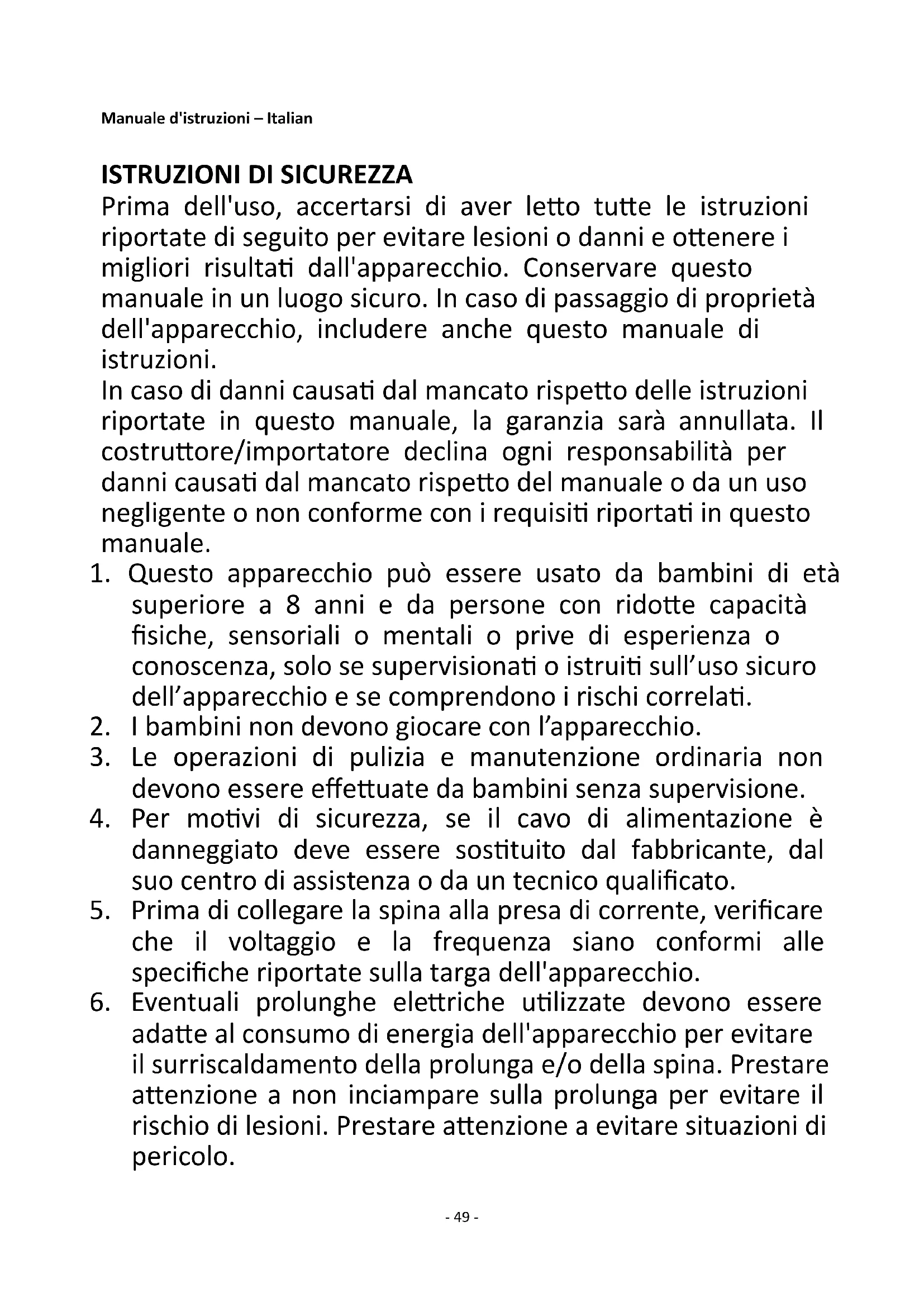 Prima dell'uso, accertarsi di aver letto tutte le istruzioni riportate di seguito per evitare lesioni o danni e ottenere i migliori risultati dall'apparecchio. Conservare questo manuale in un luogo sicuro. In caso di passaggio di proprietà dell'apparecchio, includere anche questo manuale di istruzioni. In caso di danni causati dal mancato rispetto delle istruzioni riportate in questo manuale, la garanzia sarà annullata. Il costruttore/importatore declina ogni responsabilità per danni causati dal mancato rispetto del manuale o da un uso negligente o non conforme con i requisiti riportati in questo manuale.