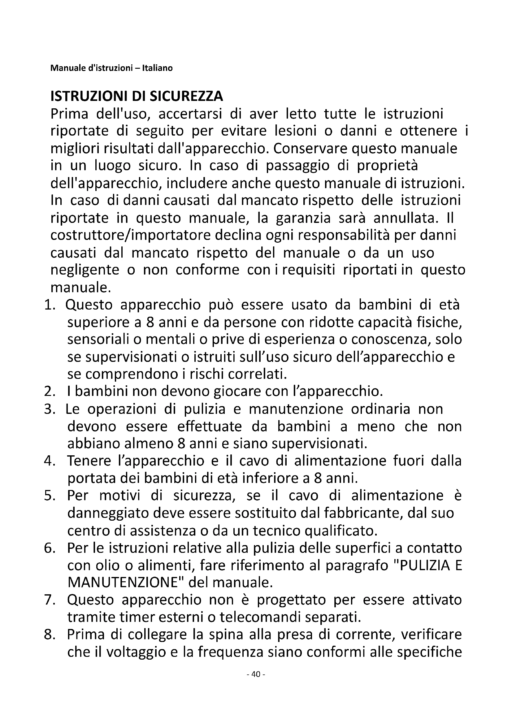 Prima dell'uso, accertarsi di aver letto tutte le istruzioni riportate di seguito per evitare lesioni o danni e ottenere i migliori risultati dall'apparecchio. Conservare questo manuale in un luogo sicuro. In caso di passaggio di proprietà dell'apparecchio, includere anche questo manuale di istruzioni. In caso di danni causati dal mancato rispetto delle istruzioni riportate in questo manuale, la garanzia sarà annullata. Il costruttore/importatore declina ogni responsabilità per danni causati dal mancato rispetto del manuale o da un uso negligente o non conforme con i requisiti riportati in questo manuale.