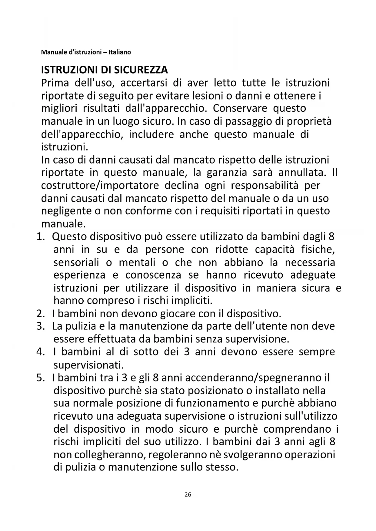 Prima dell'uso, accertarsi di aver letto tutte le istruzioni riportate di seguito per evitare lesioni o danni e ottenere i migliori risultati dall'apparecchio. Conservare questo manuale in un luogo sicuro. In caso di passaggio di proprietà dell'apparecchio, includere anche questo manuale di istruzioni. In caso di danni causati dal mancato rispetto delle istruzioni riportate in questo manuale, la garanzia sarà annullata. Il costruttore/importatore declina ogni responsabilità per danni causati dal mancato rispetto del manuale o da un uso negligente o non conforme con i requisiti riportati in questo manuale.