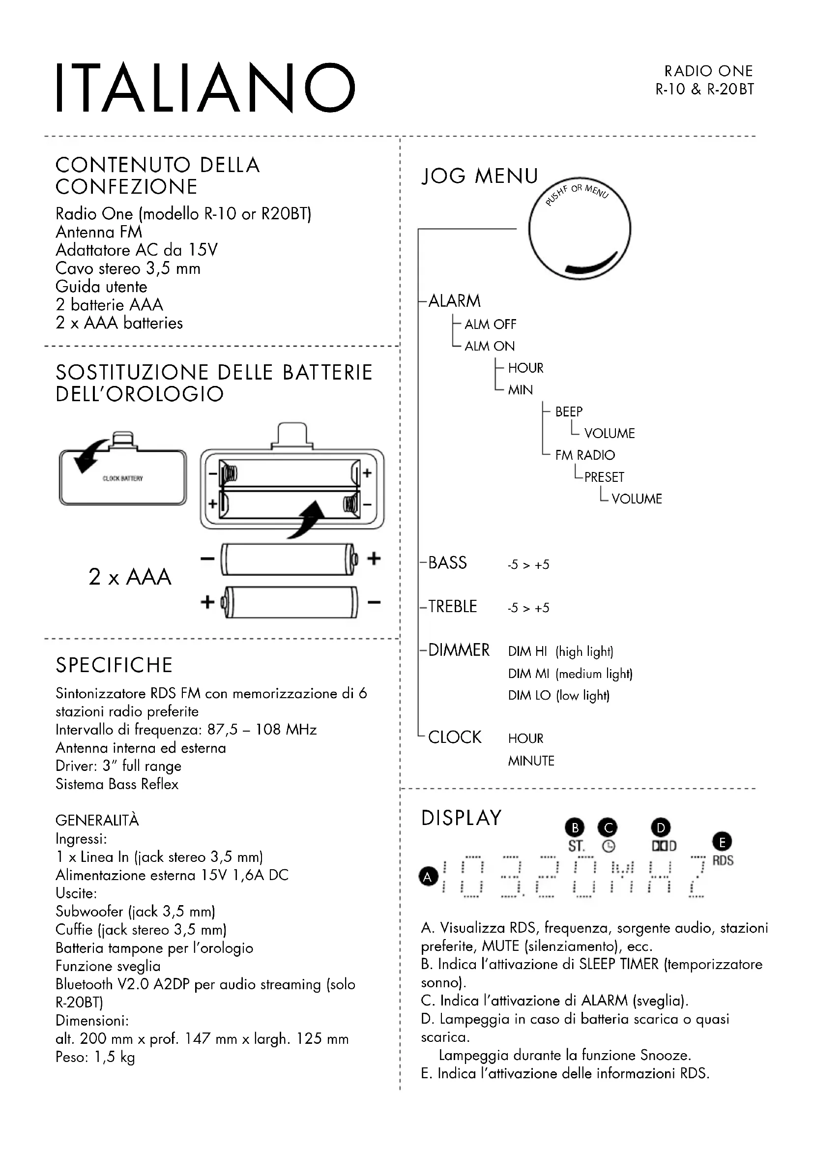 DELL’OROLOGIO ITALIANO RADIO ONE R-10 & R-20BT SPECIFICHE Sintonizzatore RDS FM con memorizzazione di 6 stazioni radio preferite Intervallo di frequenza: 87,5 – 108 MHz Antenna interna ed esterna Driver: 3” full range Sistema Bass Reflex GENERALITÀ Ingressi: 1 x Linea In (jack stereo 3,5 mm) Alimentazione esterna 15V 1,6A DC Uscite: Subwoofer (jack 3,5 mm) Cuffie (jack stereo 3,5 mm) Batteria tampone per l’orologio Funzione sveglia Bluetooth V2.0 A2DP per audio streaming (solo R-20BT) Dimensioni: alt. 200 mm x prof. 147 mm x largh. 125 mm Peso: 1,5 kg A. Visualizza RDS, frequenza, sorgente audio, stazioni preferite, MUTE (silenziamento), ecc. B. Indica l’attivazione di SLEEP TIMER (temporizzatore sonno). C. Indica l’attivazione di ALARM (sveglia). D. Lampeggia in caso di batteria scarica o quasi scarica. Lampeggia durante la funzione Snooze. E. Indica l’attivazione delle informazioni RDS. ALARM ALM OFF ALM ON HOUR MIN BEEP VOLUME FM RADIO PRESET VOLUME