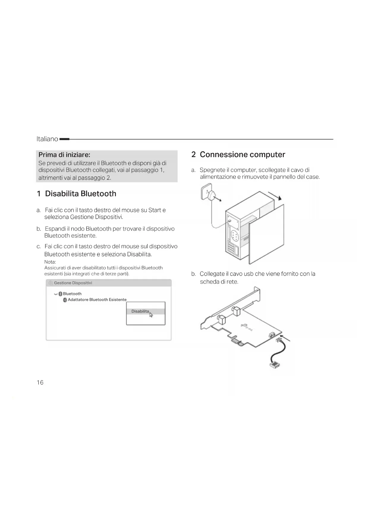 2 Connessione computer a. Spegnete il computer, scollegate il cavo di alimentazione e rimuovete il pannello del case. b. Collegate il cavo usb che viene fornito con la scheda di rete. 1 Disabilita Bluetooth a. Fai clic con il tasto destro del mouse su Start e seleziona Gestione Dispositivi. b. Espandi il nodo Bluetooth per trovare il dispositivo Bluetooth esistente. c. Fai clic con il tasto destro del mouse sul dispositivo Bluetooth esistente e seleziona Disabilita. Nota: Assicurati di aver disabilitato tutti i dispositivi Bluetooth esistenti (sia integrati che di terze parti). Bluetooth Gestione Dispositivi Adattatore Bluetooth Esistente Disabilita Prima di iniziare: Se prevedi di utilizzare il Bluetooth e disponi già di dispositivi Bluetooth collegati, vai al passaggio 1, altrimenti vai al passaggio 2.17 Italiano c. Individuate uno slot PCIE X1 libero e inseriteci la scheda di rete. Nota: Se la staa non è adeguata per il vostro computer, sostituitela con la staa low-prole. d. Individuate un conettore F_USB libero e collegateci il cavo usb. USB e. Collegate l'antenna (o le antenne) alla scheda di rete. Nota: Per migliorare le prestazioni, assicuratevi che non vi siano ostacoli tra la antenne e il router. f. Riposizionate il pannello del case, collegate il cavo di alimentazione e accendete il computer. 3 Installazione Drivers a. Inserite il CD e lanciate Autorun.exe. Nota: potete vericare se vi sono driver aggiornati e scaricarli nella seguente pagina web: https://www.tp-link.com/it/support/download/ b. Installazione Driver Wi-Fi e Bluetooth.