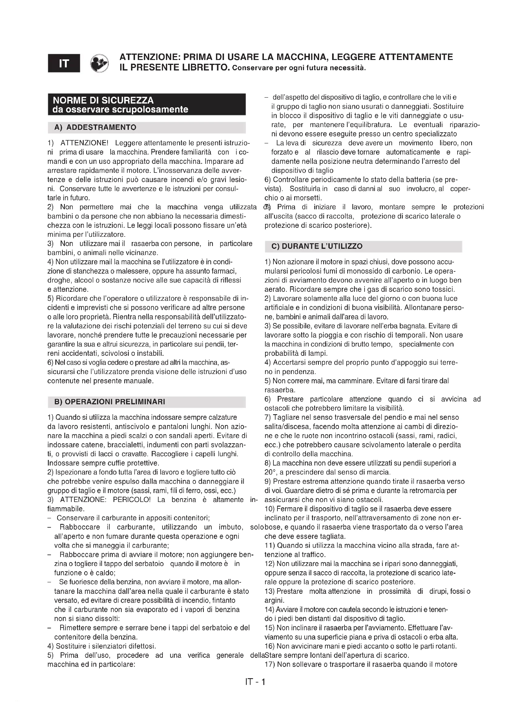 ATTENZIONE: PRIMA DI USARE LA MACCHINA, LEGGERE ATTENTAMENTE IL PRESENTE LIBRETTO. Conservare per ogni futura necessità. – dell’aspetto del dispositivo di taglio, e controllare che le viti e il gruppo di taglio non siano usurati o danneggiati. Sostituire in blocco il dispositivo di taglio e le viti danneggiate o usu- rate, per mantenere l’equilibratura. Le eventuali riparazio- ni devono essere eseguite presso un centro specializzato – La leva di sicurezza deve avere un movimento libero, non forzato e al rilascio deve tornare automaticamente e rapi- damente nella posizione neutra determinando l’arresto del dispositivo di taglio 6) Controllare periodicamente lo stato della batteria (se pre- vista). Sostituirla in caso di danni al suo involucro, al coper- chio o ai morsetti. 7) Prima di iniziare il lavoro, montare sempre le protezioni all’uscita (sacco di raccolta, protezione di scarico laterale o protezione di scarico posteriore).