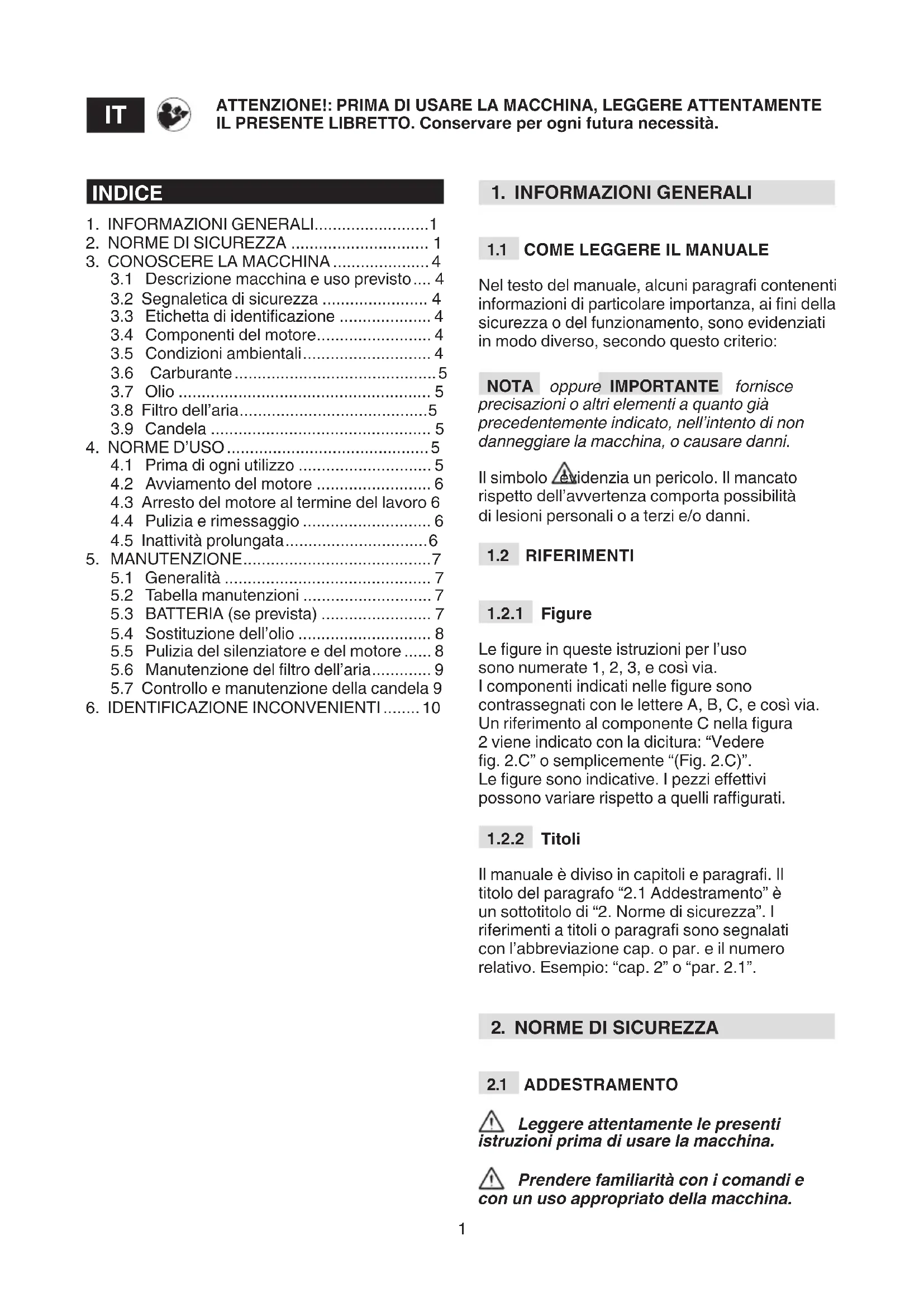 Leggere attentamente le presenti istruzioni prima di usare la macchina. Prendere familiarità con i comandi e con un uso appropriato della macchina. ATTENZIONE!: PRIMA DI USARE LA MACCHINA, LEGGERE ATTENTAMENTE IL PRESENTE LIBRETTO. Conservare per ogni futura necessità.