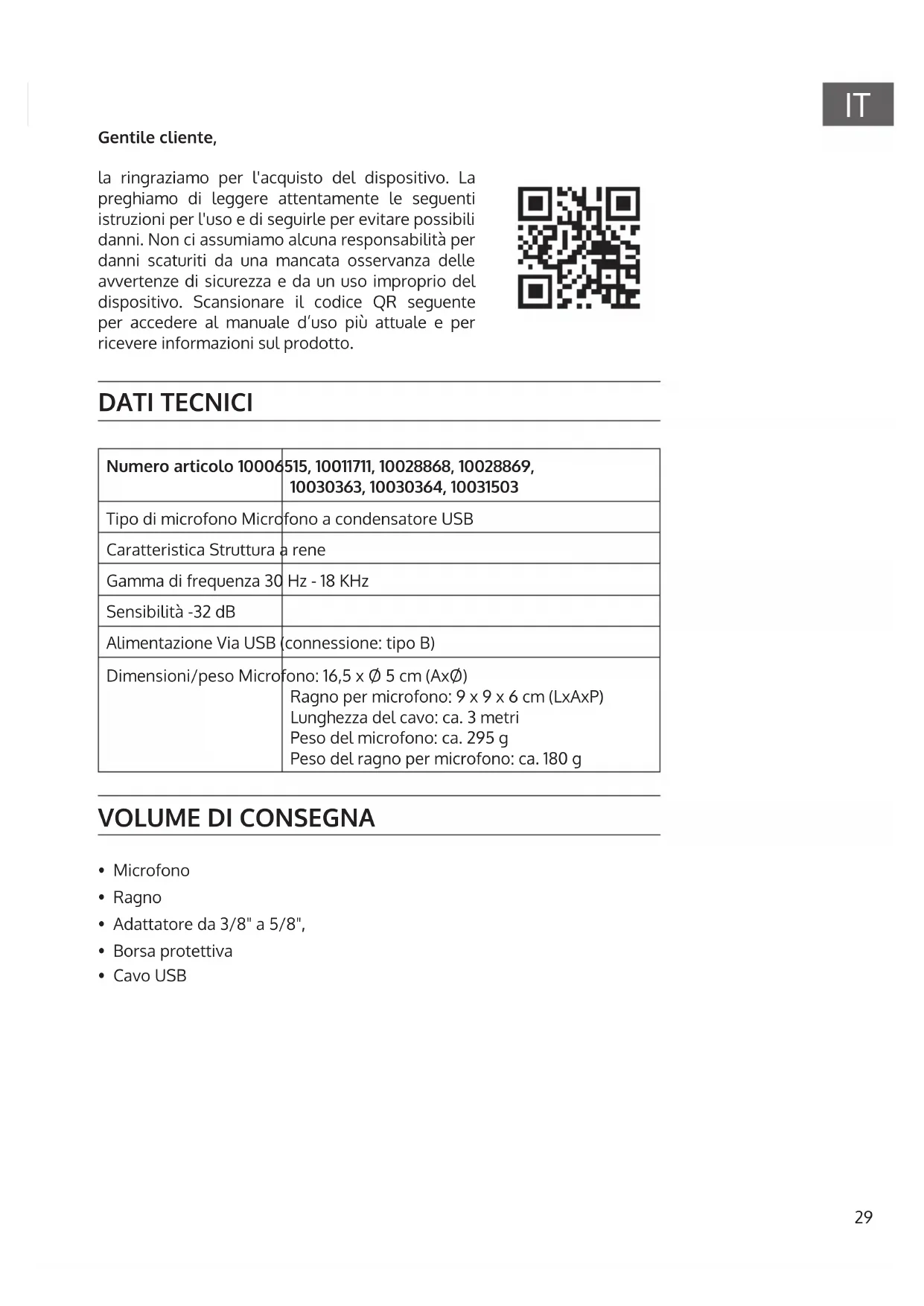 Gentile cliente, la ringraziamo per l'acquisto del dispositivo. La preghiamo di leggere attentamente le seguenti istruzioni per l'uso e di seguirle per evitare possibili danni. Non ci assumiamo alcuna responsabilità per danni scaturiti da una mancata osservanza delle avvertenze di sicurezza e da un uso improprio del dispositivo. Scansionare il codice QR seguente per accedere al manuale d’uso più attuale e per ricevere informazioni sul prodotto. DATI TECNICI Numero articolo 10006515, 10011711, 10028868, 10028869, 10030363, 10030364, 10031503 Tipo di microfono Microfono a condensatore USB Caratteristica Struttura a rene Gamma di frequenza 30 Hz - 18 KHz Sensibilità -32 dB Alimentazione Via USB (connessione: tipo B) Dimensioni/peso Microfono: 16,5 x Ø 5 cm (AxØ) Ragno per microfono: 9 x 9 x 6 cm (LxAxP) Lunghezza del cavo: ca. 3 metri Peso del microfono: ca. 295 g Peso del ragno per microfono: ca. 180 g