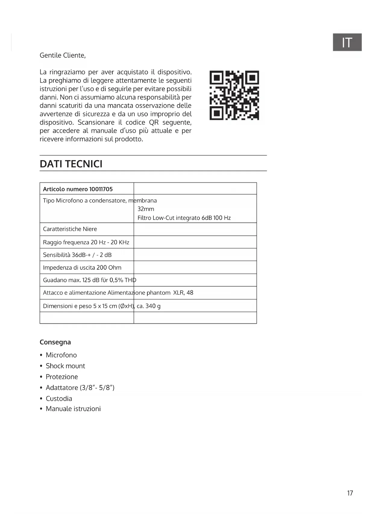 Gentile Cliente, La ringraziamo per aver acquistato il dispositivo. La preghiamo di leggere attentamente le seguenti istruzioni per l’uso e di seguirle per evitare possibili danni. Non ci assumiamo alcuna responsabilità per danni scaturiti da una mancata osservazione delle avvertenze di sicurezza e da un uso improprio del dispositivo. Scansionare il codice QR seguente, per accedere al manuale d’uso più attuale e per ricevere informazioni sul prodotto. DATI TECNICI Articolo numero 10011705 Tipo Microfono a condensatore, membrana 32mm Filtro Low-Cut integrato 6dB 100Hz Caratteristiche Niere Raggio frequenza 20 Hz - 20 KHz Sensibilità 36dB-+ / - 2 dB Impedenza di uscita 200 Ohm Guadano max. 125 dB für 0,5% THD Attacco e alimentazione Alimentazione phantom XLR, 48 Dimensioni e peso 5 x 15 cm (ØxH), ca. 340g Consegna