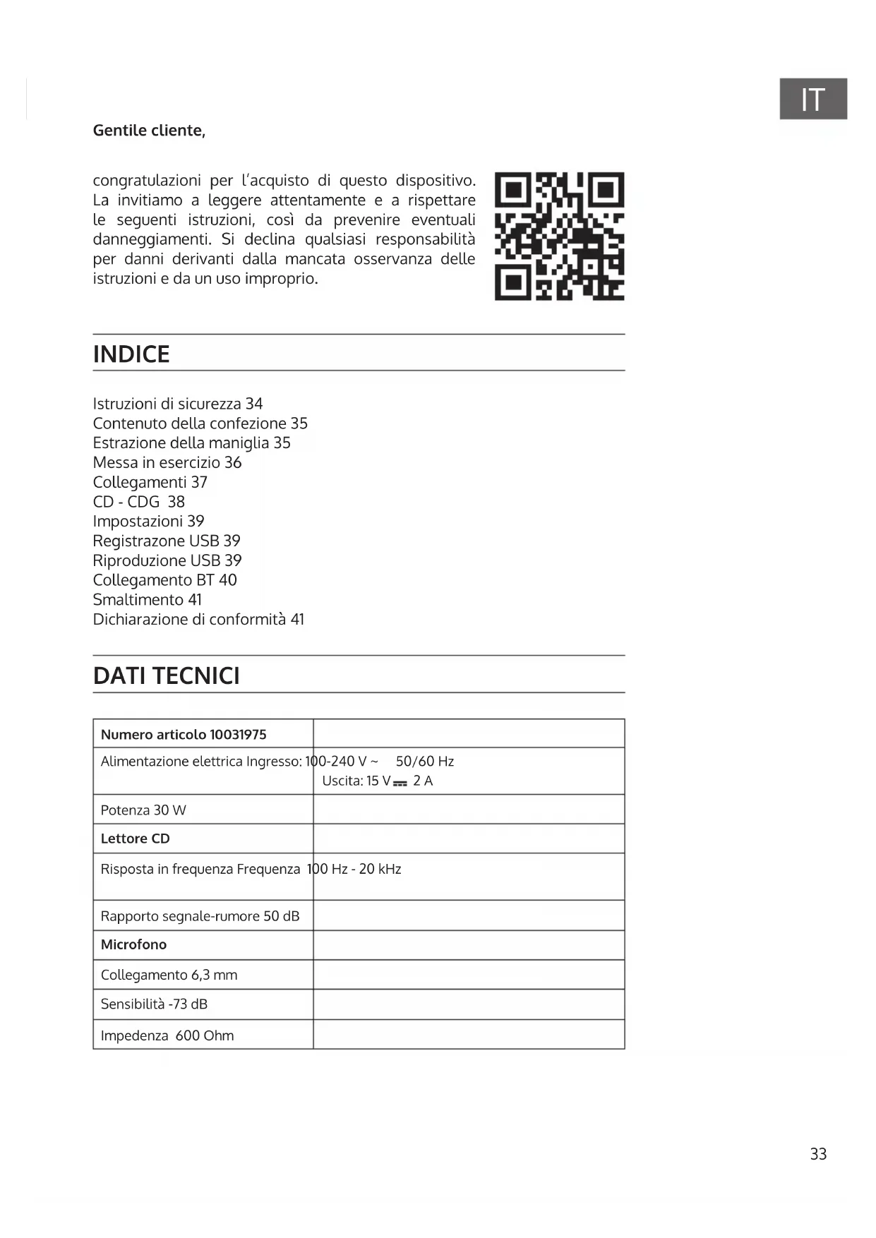 Impostazioni 39 Registrazone USB 39 Riproduzione USB 39 Collegamento BT 40 Smaltimento 41 Dichiarazione di conformità 41 DATI TECNICI Numero articolo 10031975 Alimentazione elettrica Ingresso: 100-240 V ~ 50/60 Hz Uscita: 15 V 2 A Potenza 30 W Lettore CD Risposta in frequenza Frequenza 100 Hz - 20 kHz Rapporto segnale-rumore 50 dB Microfono Collegamento 6,3 mm Sensibilità -73 dB Impedenza 600 Ohm34