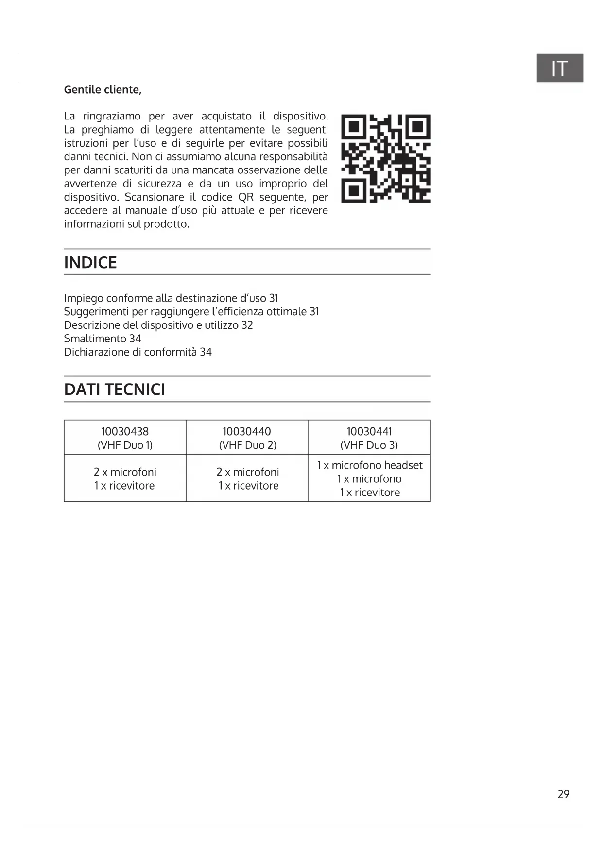 Gentile cliente, La ringraziamo per aver acquistato il dispositivo. La preghiamo di leggere attentamente le seguenti istruzioni per l’uso e di seguirle per evitare possibili danni tecnici. Non ci assumiamo alcuna responsabilità per danni scaturiti da una mancata osservazione delle avvertenze di sicurezza e da un uso improprio del dispositivo. Scansionare il codice QR seguente, per accedere al manuale d’uso più attuale e per ricevere informazioni sul prodotto. INDICE Impiego conforme alla destinazione d’uso 31 Suggerimenti per raggiungere l’eicienza ottimale 31 Descrizione del dispositivo e utilizzo 32 Smaltimento 34 Dichiarazione di conformità 34 DATI TECNICI