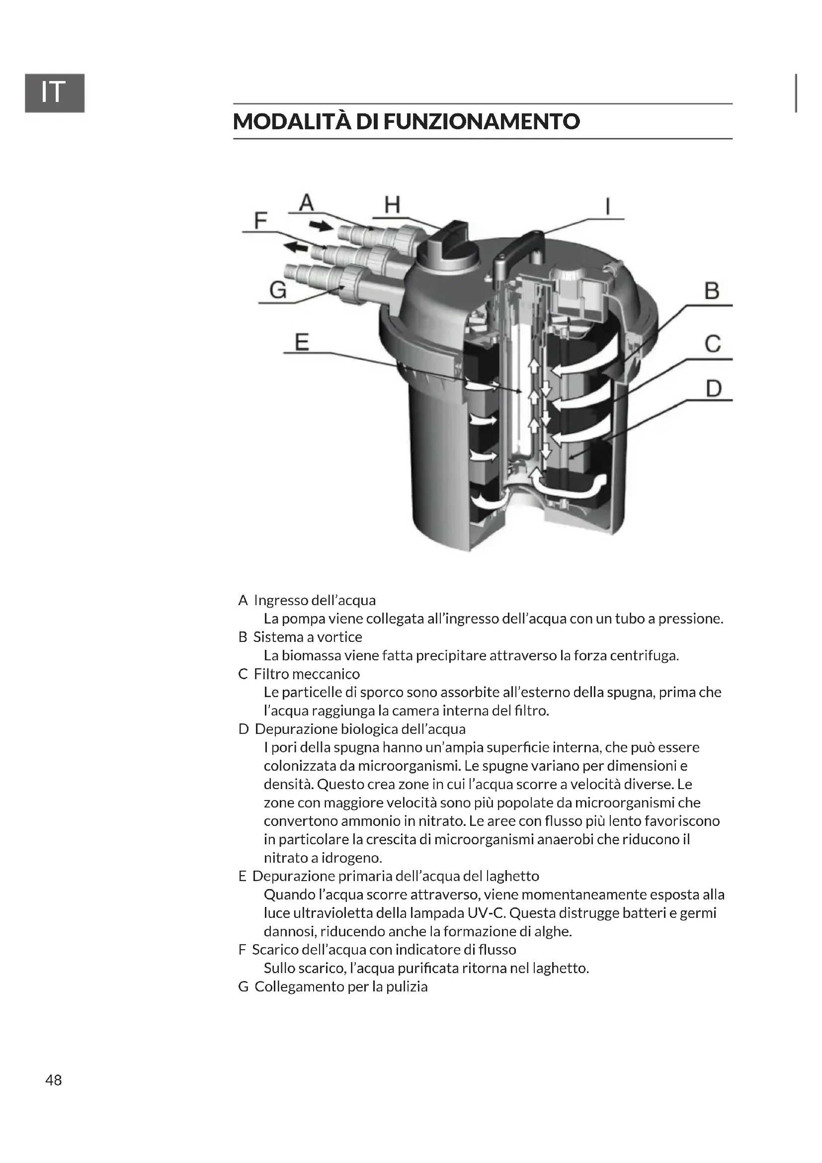 A Ingresso dell’acqua La pompa viene collegata all’ingresso dell’acqua con un tubo a pressione. B Sistema a vortice La biomassa viene fatta precipitare attraverso la forza centrifuga. C Filtro meccanico Le particelle di sporco sono assorbite all’esterno della spugna, prima che l’acqua raggiunga la camera interna del ltro. D Depurazione biologica dell’acqua I pori della spugna hanno un’ampia supercie interna, che può essere colonizzata da microorganismi. Le spugne variano per dimensioni e densità. Questo crea zone in cui l’acqua scorre a velocità diverse. Le zone con maggiore velocità sono più popolate da microorganismi che convertono ammonio in nitrato. Le aree con usso più lento favoriscono in particolare la crescita di microorganismi anaerobi che riducono il nitrato a idrogeno. E Depurazione primaria dell’acqua del laghetto Quando l’acqua scorre attraverso, viene momentaneamente esposta alla luce ultravioletta della lampada UV-C. Questa distrugge batteri e germi dannosi, riducendo anche la formazione di alghe. F Scarico dell’acqua con indicatore di usso Sullo scarico, l’acqua puricata ritorna nel laghetto. G Collegamento per la pulizia49