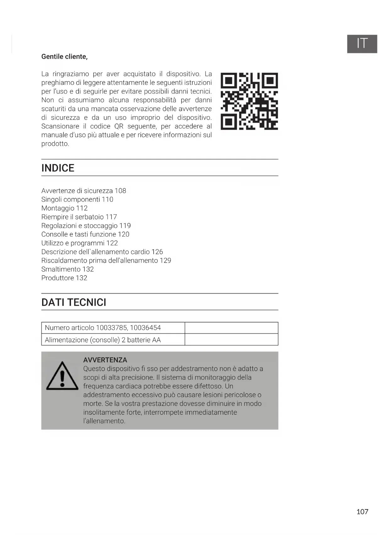 Gentile cliente, La ringraziamo per aver acquistato il dispositivo. La preghiamo di leggere attentamente le seguenti istruzioni per l’uso e di seguirle per evitare possibili danni tecnici. Non ci assumiamo alcuna responsabilità per danni scaturiti da una mancata osservazione delle avvertenze di sicurezza e da un uso improprio del dispositivo. Scansionare il codice QR seguente, per accedere al manuale d’uso più attuale e per ricevere informazioni sul prodotto. INDICE Avvertenze di sicurezza 108 Singoli componenti 110 Montaggio 112 Riempire il serbatoio 117 Regolazioni e stoccaggio 119 Consolle e tasti funzione 120 Utilizzo e programmi 122 Descrizione dell`allenamento cardio 126 Riscaldamento prima dell’allenamento 129 Smaltimento 132 Produttore 132 DATI TECNICI Numero articolo 10033785, 10036454 Alimentazione (consolle) 2 batterie AA AVVERTENZA Questo dispositivo sso per addestramento non è adatto a scopi di alta precisione. Il sistema di monitoraggio della frequenza cardiaca potrebbe essere difettoso. Un addestramento eccessivo può causare lesioni pericolose o morte. Se la vostra prestazione dovesse diminuire in modo insolitamente forte, interrompete immediatamente l‘allenamento.108