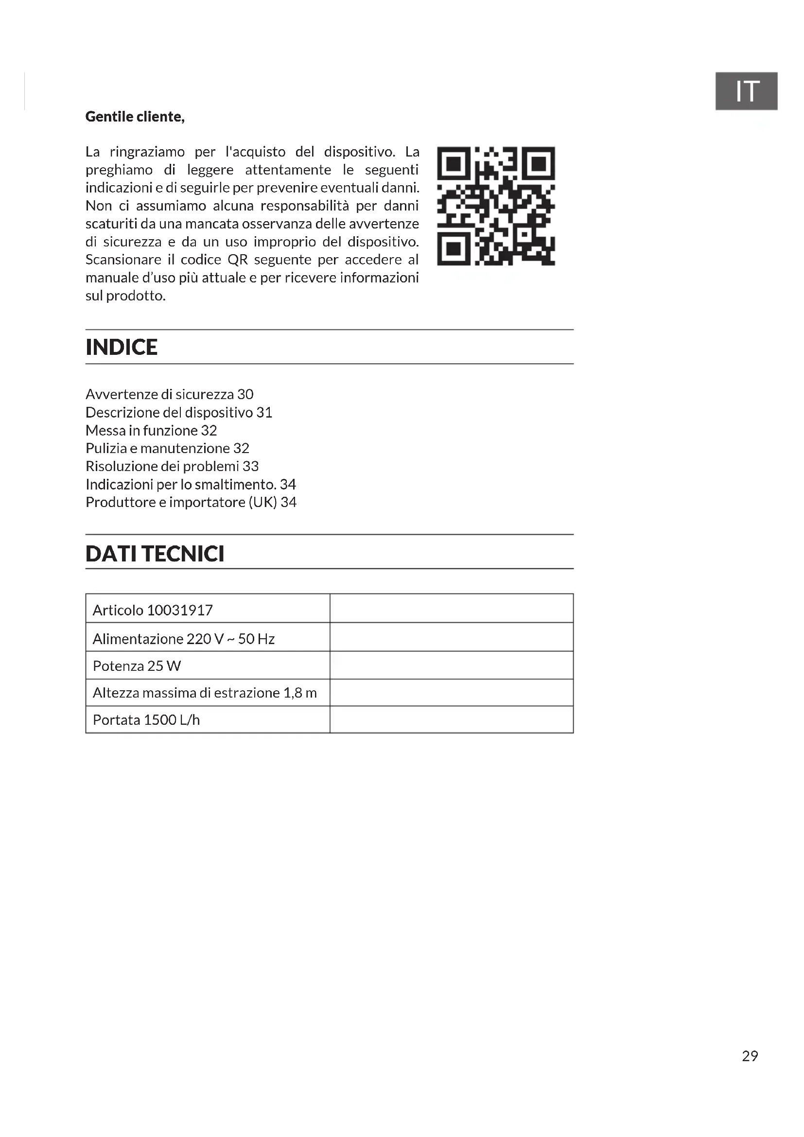 Gentile cliente, La ringraziamo per l'acquisto del dispositivo. La preghiamo di leggere attentamente le seguenti indicazioni e di seguirle per prevenire eventuali danni. Non ci assumiamo alcuna responsabilità per danni scaturiti da una mancata osservanza delle avvertenze di sicurezza e da un uso improprio del dispositivo. Scansionare il codice QR seguente per accedere al manuale d’uso più attuale e per ricevere informazioni sul prodotto. INDICE Avvertenze di sicurezza 30 Descrizione del dispositivo 31 Messa in funzione 32 Pulizia e manutenzione 32 Risoluzione dei problemi 33 Indicazioni per lo smaltimento. 34 Produttore e importatore (UK) 34 DATI TECNICI Articolo 10031917 Alimentazione 220 V ~ 50 Hz Potenza 25 W Altezza massima di estrazione 1,8 m Portata 1500 L/h30