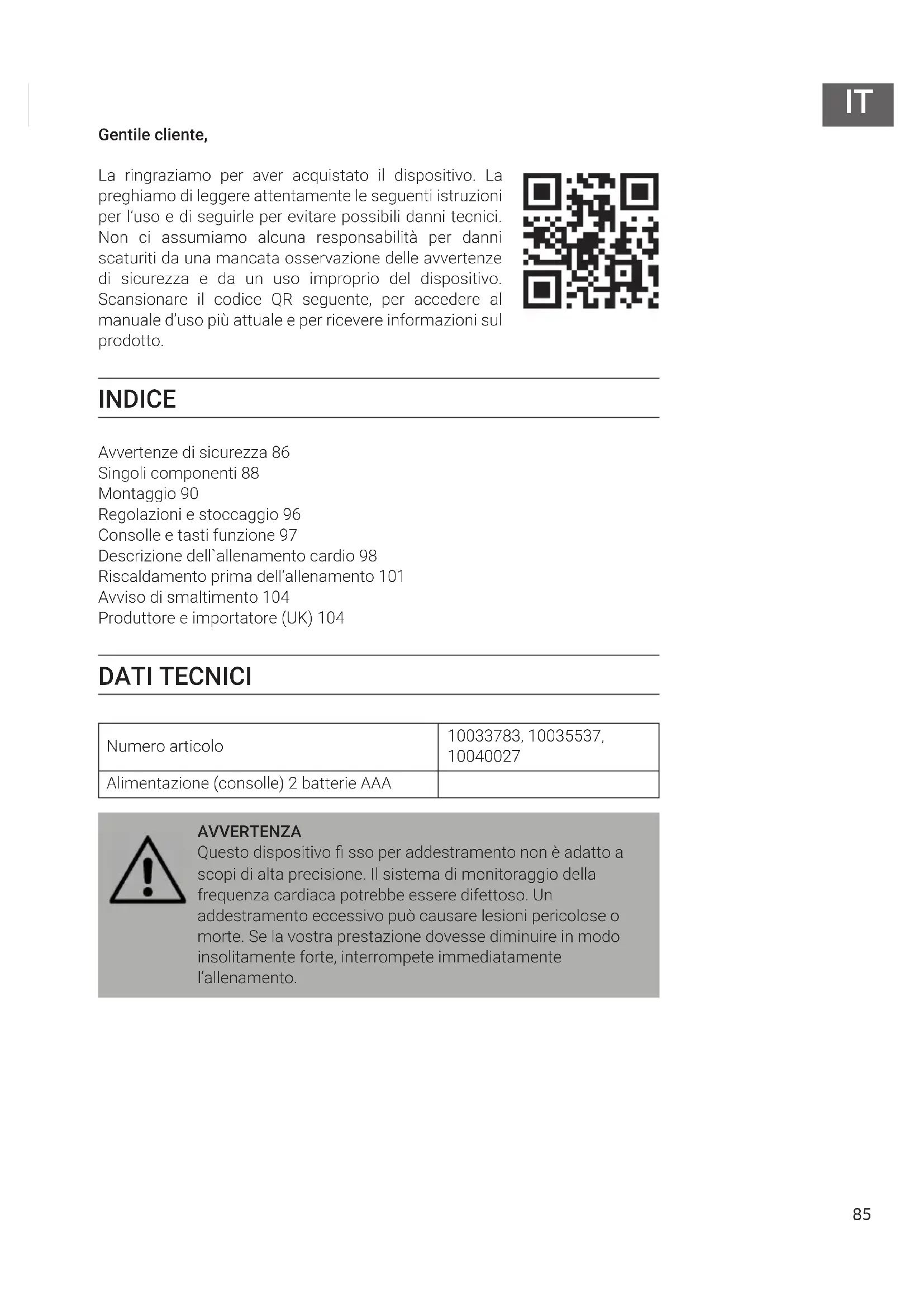 Gentile cliente, La ringraziamo per aver acquistato il dispositivo. La preghiamo di leggere attentamente le seguenti istruzioni per l’uso e di seguirle per evitare possibili danni tecnici. Non ci assumiamo alcuna responsabilità per danni scaturiti da una mancata osservazione delle avvertenze di sicurezza e da un uso improprio del dispositivo. Scansionare il codice QR seguente, per accedere al manuale d’uso più attuale e per ricevere informazioni sul prodotto. INDICE Avvertenze di sicurezza 86 Singoli componenti 88 Montaggio 90 Regolazioni e stoccaggio 96 Consolle e tasti funzione 97 Descrizione dell`allenamento cardio 98 Riscaldamento prima dell’allenamento 101 Avviso di smaltimento 104 Produttore e importatore (UK) 104 DATI TECNICI Numero articolo 10033783, 10035537,