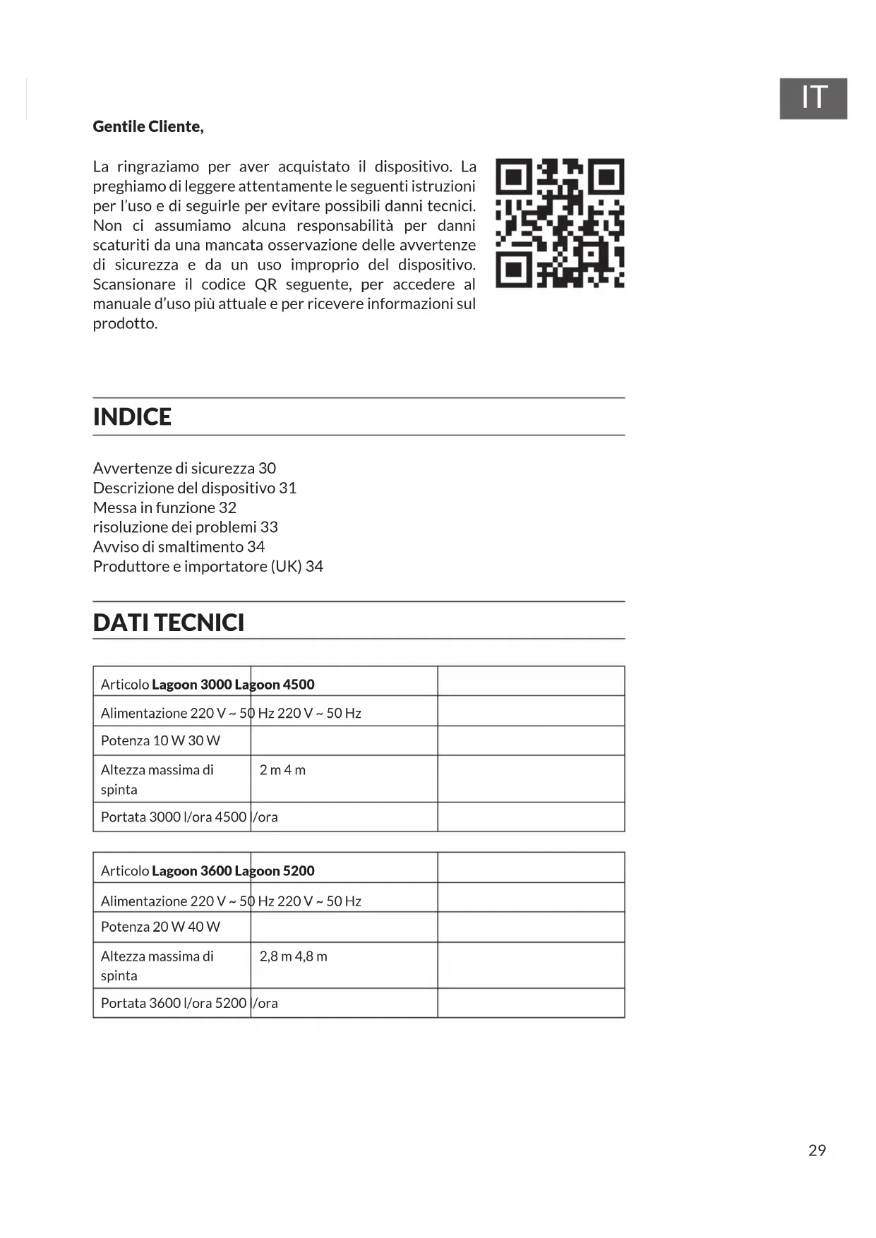 Gentile Cliente, La ringraziamo per aver acquistato il dispositivo. La preghiamo di leggere attentamente le seguenti istruzioni per l’uso e di seguirle per evitare possibili danni tecnici. Non ci assumiamo alcuna responsabilità per danni scaturiti da una mancata osservazione delle avvertenze di sicurezza e da un uso improprio del dispositivo. Scansionare il codice QR seguente, per accedere al manuale d’uso più attuale e per ricevere informazioni sul prodotto. INDICE Avvertenze di sicurezza 30 Descrizione del dispositivo 31 Messa in funzione 32 risoluzione dei problemi 33 Avviso di smaltimento 34 Produttore e importatore (UK) 34 DATI TECNICI Articolo Lagoon 3000 Lagoon 4500 Alimentazione 220 V ~ 50 Hz 220 V ~ 50 Hz Potenza 10 W 30 W Altezza massima di spinta 2 m 4 m Portata 3000 l/ora 4500 l/ora Articolo Lagoon 3600 Lagoon 5200 Alimentazione 220 V ~ 50 Hz 220 V ~ 50 Hz Potenza 20 W 40 W Altezza massima di spinta 2,8 m 4,8 m Portata 3600 l/ora 5200 l/ora30