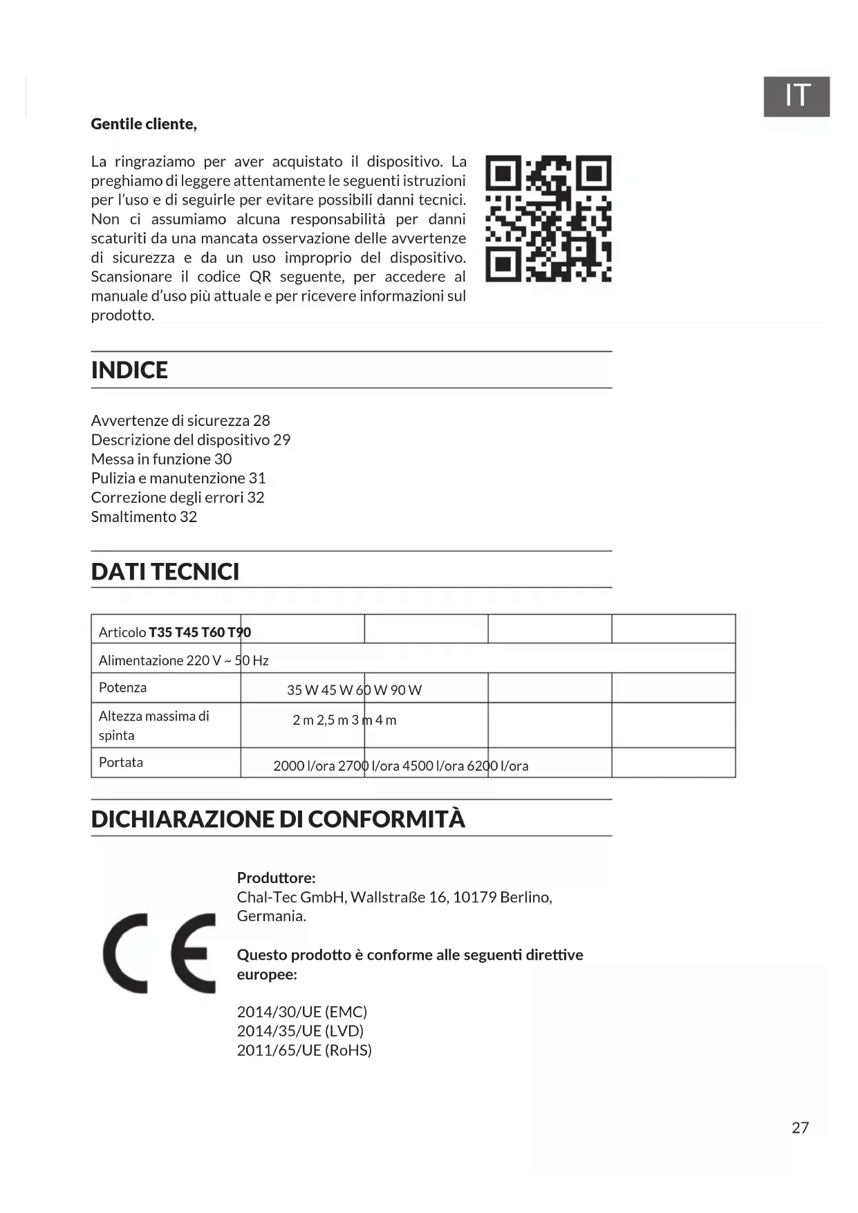 Gentile cliente, La ringraziamo per aver acquistato il dispositivo. La preghiamo di leggere attentamente le seguenti istruzioni per l’uso e di seguirle per evitare possibili danni tecnici. Non ci assumiamo alcuna responsabilità per danni scaturiti da una mancata osservazione delle avvertenze di sicurezza e da un uso improprio del dispositivo. Scansionare il codice QR seguente, per accedere al manuale d’uso più attuale e per ricevere informazioni sul prodotto. INDICE Avvertenze di sicurezza 28 Descrizione del dispositivo 29 Messa in funzione 30 Pulizia e manutenzione 31 Correzione degli errori 32 Smaltimento 32 DATI TECNICI Articolo T35 T45 T60 T90 Alimentazione 220 V ~ 50 Hz Potenza 35 W 45 W 60 W 90 W Altezza massima di spinta 2 m 2,5 m 3 m 4 m Portata 2000 l/ora 2700 l/ora 4500 l/ora 6200 l/ora