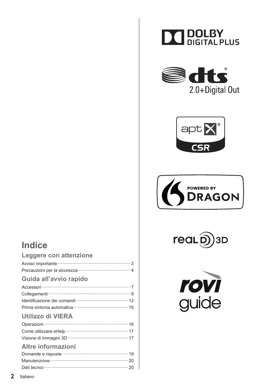 Italiano Avviso importante Avviso per le funzioni DVB / trasmissioni di dati / IPTV Per informazioni sui marchi di fabbrica, consultare [eHelp] (Supporto > Licenza). Questo televisore è progettato in conformità agli standard (aggiornati ad agosto 2013) dei servizi digitali terrestri DVB-T / T2 (MPEG2 e MPEG4AVC(H.264)) e dei servizi digitali via cavo DVB-C (MPEG2 e MPEG4-AVC(H.264)). Per la disponibilità dei servizi DVB-T / T2 nella propria area, rivolgersi al rivenditore di zona. Per la disponibilità dei servizi DVB-C con il presente televisore, rivolgersi al provider di servizi via cavo. Questo televisore potrebbe non funzionare correttamente con segnali che non siano conformi agli standard DVB-T / T2 o DVB-C. La disponibilità delle caratteristiche varia a seconda del paese, dell’area geografica, dell’emittente, del provider di servizi e dell’ambiente di rete. Non tutti i moduli CI (interfaccia comune) funzionano correttamente con questo televisore. Rivolgersi al provider di servizi per informazioni sui moduli CI disponibili. Questo televisore potrebbe non funzionare correttamente con i moduli CI non approvati dal provider di servizi. A seconda del provider di servizi, possono essere applicate tariffe aggiuntive. La compatibilità con i servizi futuri non è garantita. Controllare le informazioni più aggiornate sui servizi disponibili sul sito Web indicato di seguito. (Solo in inglese) http://panasonic.net/viera/support Panasonic non garantisce il funzionamento e le prestazioni dei dispositivi periferici di altri produttori e non si assume alcuna responsabilità o danno indotti da funzionamento e/o prestazioni derivanti dall’utilizzo dei dispositivi periferici di tali produttori. Questo prodotto ha la licenza del portafoglio del brevetto AVC per l’uso personale e non commerciale di un utente per (i) la codifica video conforme allo standard AVC (“AVC Video”) e/o (ii) la decodifica AVC Video codificata dall’utente che svolge una attività personale e non commerciale e/o ottenuta da un fornitore video dotato della licenza di fornire il servizio AVC Video. Non viene concessa alcuna licenza, implicita o esplicita, per altro uso. Si possono ottenere informazioni addizionali da MPEG LA, LLC. Vedere http://www.mpegla.com. Italiano