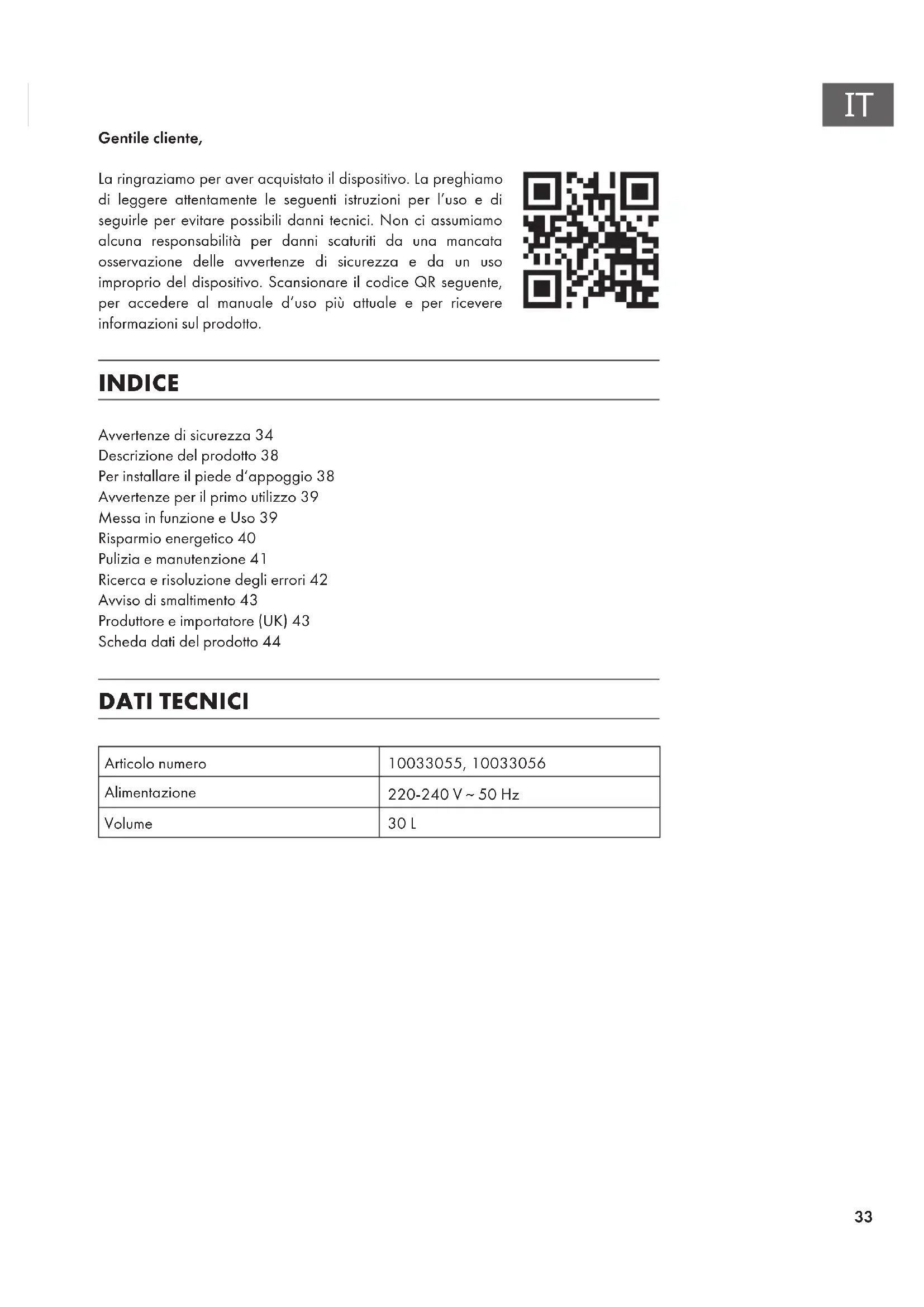 Gentile cliente, La ringraziamo per aver acquistato il dispositivo. La preghiamo di leggere attentamente le seguenti istruzioni per l’uso e di seguirle per evitare possibili danni tecnici. Non ci assumiamo alcuna responsabilità per danni scaturiti da una mancata osservazione delle avvertenze di sicurezza e da un uso improprio del dispositivo. Scansionare il codice QR seguente, per accedere al manuale d’uso più attuale e per ricevere informazioni sul prodotto. INDICE Avvertenze di sicurezza34 Descrizione del prodotto38 Per installare il piede d‘appoggio38 Avvertenze per il primo utilizzo39 Messa in funzione e Uso39 Risparmio energetico40 Pulizia e manutenzione41 Ricerca e risoluzione degli errori42 Avviso di smaltimento43 Produttore e importatore (UK)43 Scheda dati del prodotto44 DATI TECNICI Articolo numero 10033055, 10033056 Alimentazione 220-240 V ~ 50 Hz Volume 30 L34
