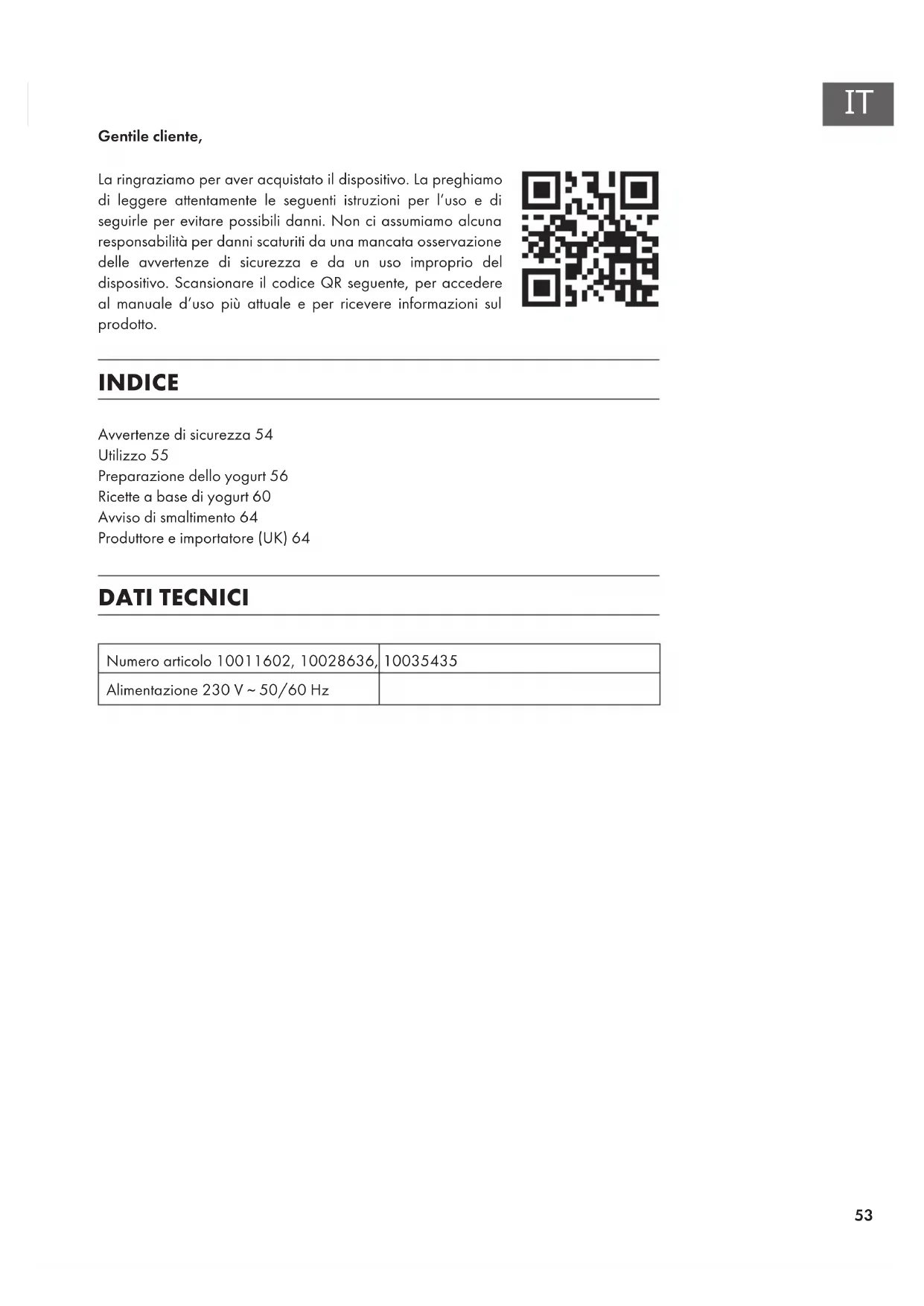 Gentile cliente, La ringraziamo per aver acquistato il dispositivo. La preghiamo di leggere attentamente le seguenti istruzioni per l’uso e di seguirle per evitare possibili danni. Non ci assumiamo alcuna responsabilità per danni scaturiti da una mancata osservazione delle avvertenze di sicurezza e da un uso improprio del dispositivo. Scansionare il codice QR seguente, per accedere al manuale d’uso più attuale e per ricevere informazioni sul prodotto. INDICE Avvertenze di sicurezza54 Utilizzo55 Preparazione dello yogurt56 Ricette a base di yogurt60 Avviso di smaltimento64 Produttore e importatore (UK)64 DATI TECNICI Numero articolo 10011602, 10028636, 10035435 Alimentazione 230 V ~ 50/60 Hz54