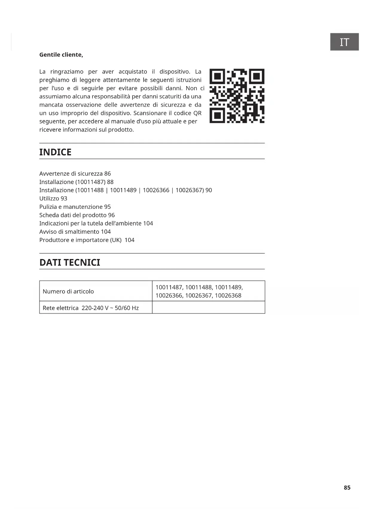 Gentile cliente, La ringraziamo per aver acquistato il dispositivo. La preghiamo di leggere attentamente le seguenti istruzioni per l’uso e di seguirle per evitare possibili danni. Non ci assumiamo alcuna responsabilità per danni scaturiti da una mancata osservazione delle avvertenze di sicurezza e da un uso improprio del dispositivo. Scansionare il codice QR seguente, per accedere al manuale d’uso più attuale e per ricevere informazioni sul prodotto. INDICE Avvertenze di sicurezza 86 Installazione (10011487) 88 Installazione (10011488 | 10011489 | 10026366 | 10026367) 90 Utilizzo 93 Pulizia e manutenzione 95 Scheda dati del prodotto 96 Indicazioni per la tutela dell’ambiente 104 Avviso di smaltimento 104 Produttore e importatore (UK) 104 DATI TECNICI Numero di articolo 10011487, 10011488, 10011489, 10026366, 10026367, 10026368 Rete elettrica 220-240 V ~ 50/60 Hz86