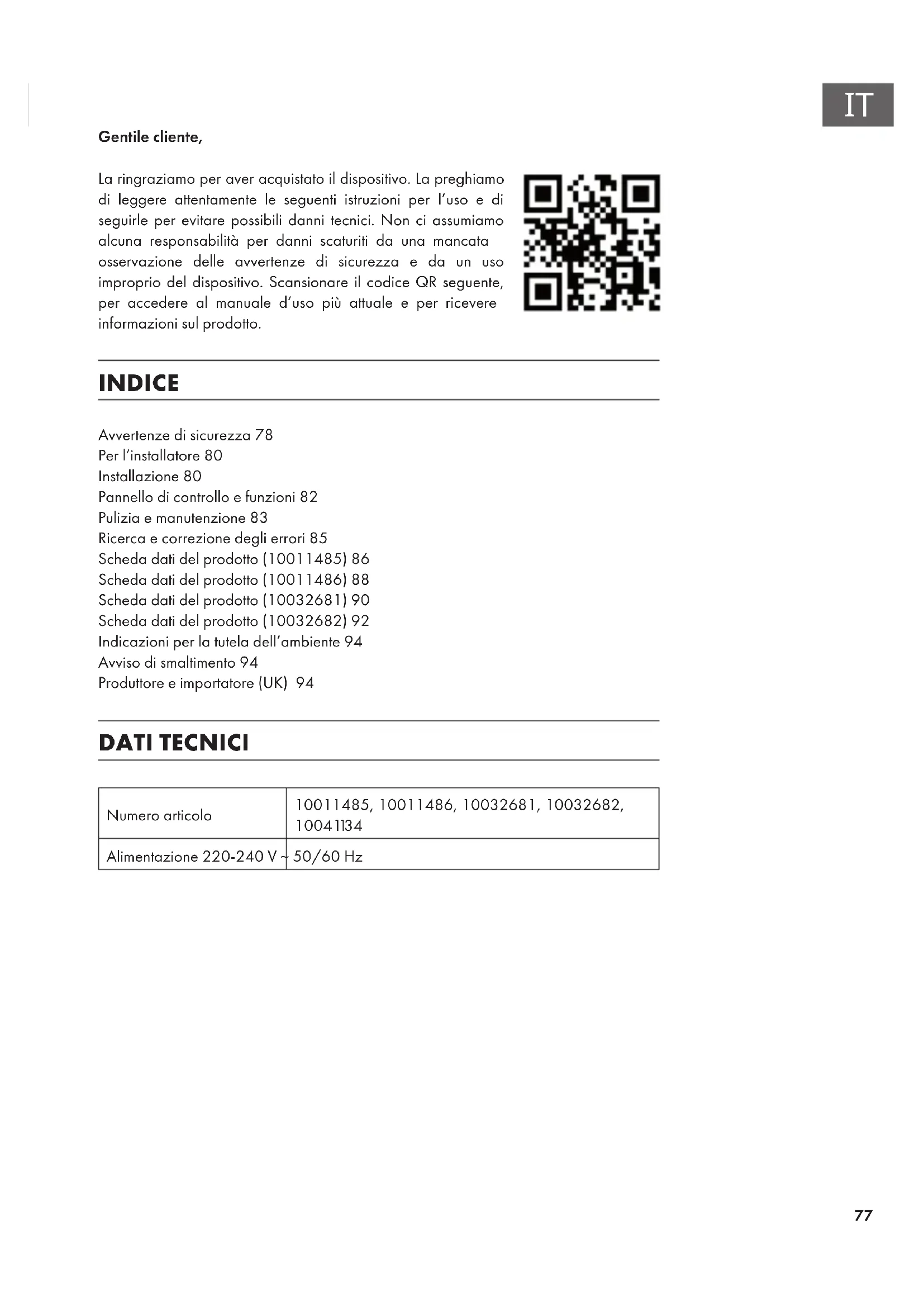 Gentile cliente, La ringraziamo per aver acquistato il dispositivo. La preghiamo di leggere attentamente le seguenti istruzioni per l’uso e di seguirle per evitare possibili danni tecnici. Non ci assumiamo alcuna responsabilità per danni scaturiti da una mancata osservazione delle avvertenze di sicurezza e da un uso improprio del dispositivo. Scansionare il codice QR seguente, per accedere al manuale d’uso più attuale e per ricevere informazioni sul prodotto. INDICE Avvertenze di sicurezza78 Per l’installatore80 Installazione80 Pannello di controllo e funzioni82 Pulizia e manutenzione83 Ricerca e correzione degli errori85 Scheda dati del prodotto (10011485)86 Scheda dati del prodotto (10011486)88 Scheda dati del prodotto (10032681)90 Scheda dati del prodotto (10032682)92 Indicazioni per la tutela dell’ambiente94 Avviso di smaltimento94 Produttore e importatore (UK) 94 DATI TECNICI Numero articolo 10011485, 10011486, 10032681, 10032682,