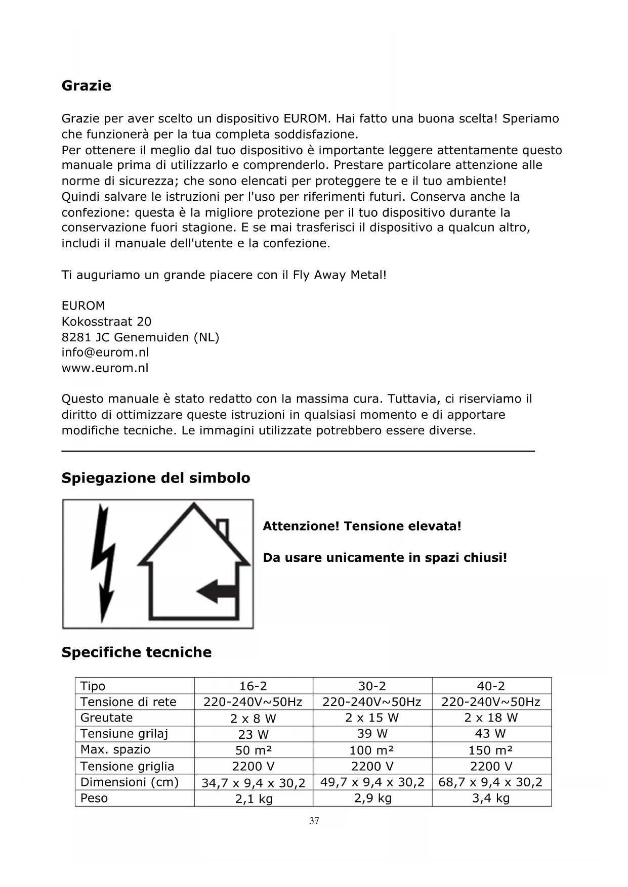 Grazie Grazie per aver scelto un dispositivo EUROM. Hai fatto una buona scelta! Speriamo che funzionerà per la tua completa soddisfazione. Per ottenere il meglio dal tuo dispositivo è importante leggere attentamente questo manuale prima di utilizzarlo e comprenderlo. Prestare particolare attenzione alle norme di sicurezza; che sono elencati per proteggere te e il tuo ambiente! Quindi salvare le istruzioni per l'uso per riferimenti futuri. Conserva anche la confezione: questa è la migliore protezione per il tuo dispositivo durante la conservazione fuori stagione. E se mai trasferisci il dispositivo a qualcun altro, includi il manuale dell'utente e la confezione. Ti auguriamo un grande piacere con il Fly Away Metal! EUROM Kokosstraat 20 8281 JC Genemuiden (NL) info@eurom.nl www.eurom.nl Questo manuale è stato redatto con la massima cura. Tuttavia, ci riserviamo il diritto di ottimizzare queste istruzioni in qualsiasi momento e di apportare modifiche tecniche. Le immagini utilizzate potrebbero essere diverse.