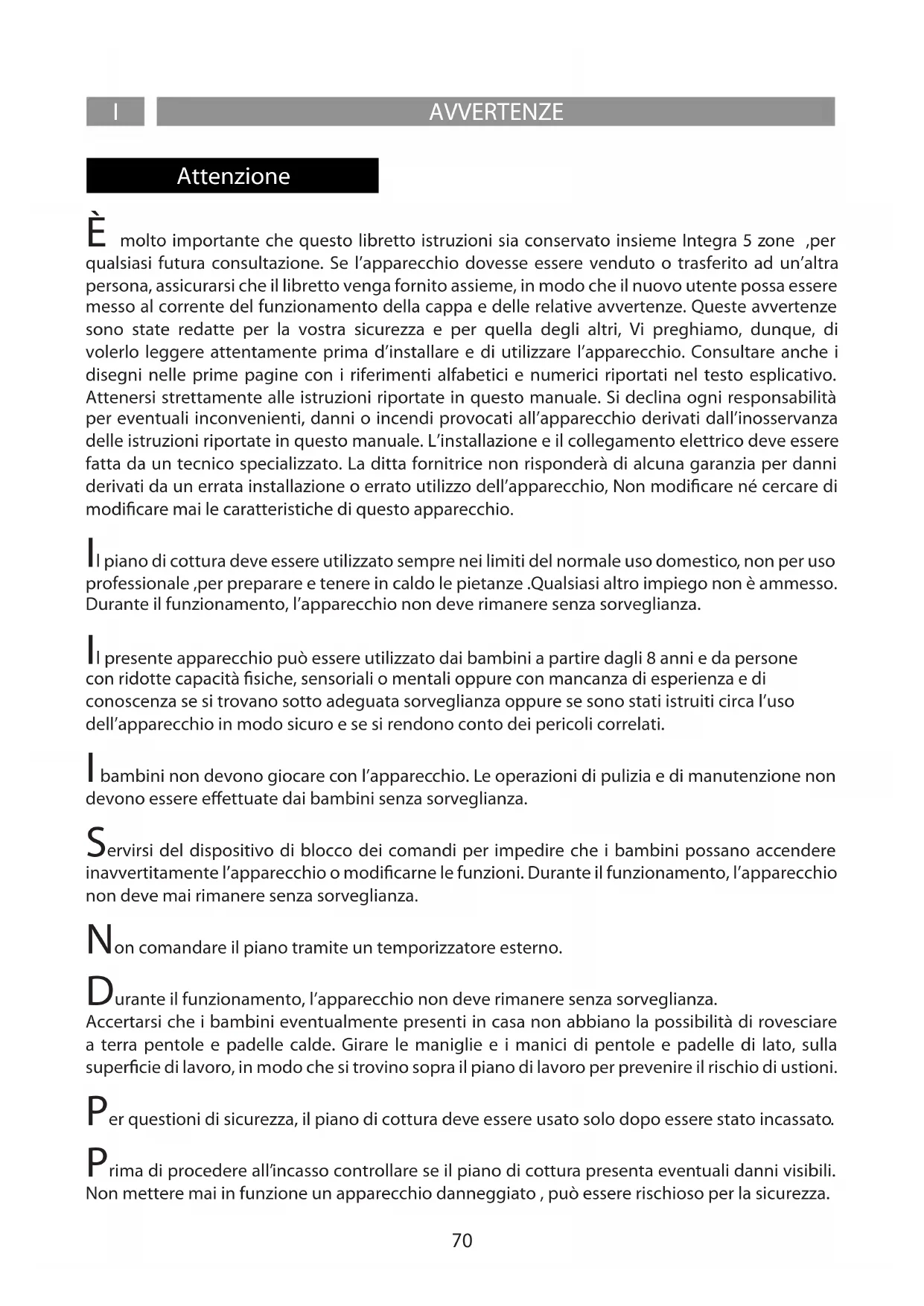 Attenzione È molto importante che questo libretto istruzioni sia conservato insieme Integra 5 zone ,per qualsiasi futura consultazione. Se l’apparecchio dovesse essere venduto o trasferito ad un’altra persona, assicurarsi che il libretto venga fornito assieme, in modo che il nuovo utente possa essere messo al corrente del funzionamento della cappa e delle relative avvertenze. Queste avvertenze sono state redatte per la vostra sicurezza e per quella degli altri, Vi preghiamo, dunque, di volerlo leggere attentamente prima d’installare e di utilizzare l’apparecchio. Consultare anche i disegni nelle prime pagine con i riferimenti alfabetici e numerici riportati nel testo esplicativo. Attenersi strettamente alle istruzioni riportate in questo manuale. Si declina ogni responsabilità per eventuali inconvenienti, danni o incendi provocati all’apparecchio derivati dall’inosservanza delle istruzioni riportate in questo manuale. L’installazione e il collegamento elettrico deve essere fatta da un tecnico specializzato. La ditta fornitrice non risponderà di alcuna garanzia per danni derivati da un errata installazione o errato utilizzo dell’apparecchio, Non modicare né cercare di modicare mai le caratteristiche di questo apparecchio. Il piano di cottura deve essere utilizzato sempre nei limiti del normale uso domestico, non per uso professionale ,per preparare e tenere in caldo le pietanze .Qualsiasi altro impiego non è ammesso. Durante il funzionamento, l’apparecchio non deve rimanere senza sorveglianza. Il presente apparecchio può essere utilizzato dai bambini a partire dagli 8 anni e da persone con ridotte capacità siche, sensoriali o mentali oppure con mancanza di esperienza e di conoscenza se si trovano sotto adeguata sorveglianza oppure se sono stati istruiti circa l’uso dell’apparecchio in modo sicuro e se si rendono conto dei pericoli correlati. I bambini non devono giocare con l’apparecchio. Le operazioni di pulizia e di manutenzione non devono essere eettuate dai bambini senza sorveglianza. Servirsi del dispositivo di blocco dei comandi per impedire che i bambini possano accendere inavvertitamente l’apparecchio o modicarne le funzioni. Durante il funzionamento, l’apparecchio non deve mai rimanere senza sorveglianza. Non comandare il piano tramite un temporizzatore esterno. Durante il funzionamento, l’apparecchio non deve rimanere senza sorveglianza. Accertarsi che i bambini eventualmente presenti in casa non abbiano la possibilità di rovesciare a terra pentole e padelle calde. Girare le maniglie e i manici di pentole e padelle di lato, sulla supercie di lavoro, in modo che si trovino sopra il piano di lavoro per prevenire il rischio di ustioni. Per questioni di sicurezza, il piano di cottura deve essere usato solo dopo essere stato incassato. Prima di procedere all’incasso controllare se il piano di cottura presenta eventuali danni visibili. Non mettere mai in funzione un apparecchio danneggiato , può essere rischioso per la sicurezza.AVVERTENZE