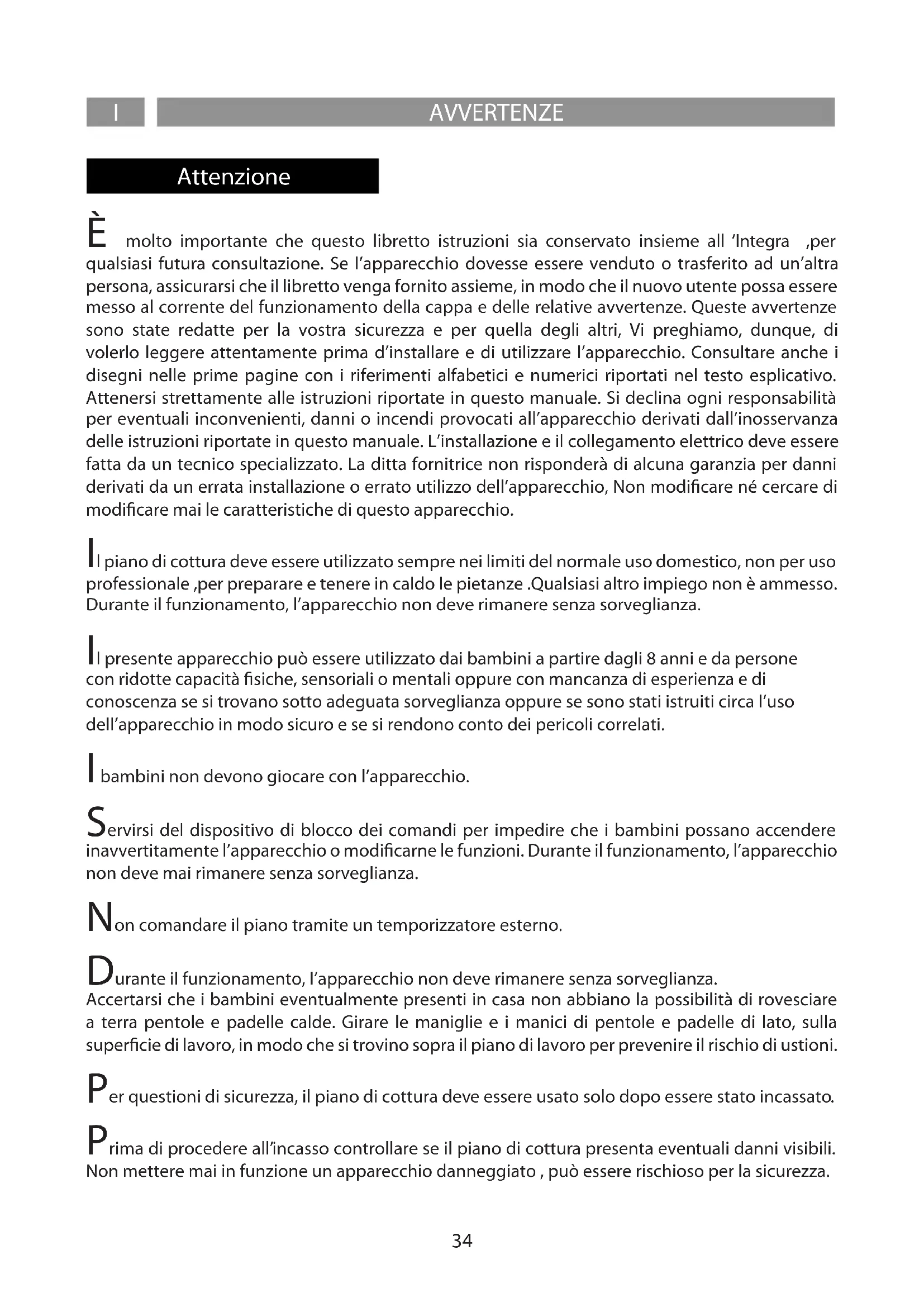 Attenzione È molto importante che questo libretto istruzioni sia conservato insieme all ‘Integra ,per qualsiasi futura consultazione. Se l’apparecchio dovesse essere venduto o trasferito ad un’altra persona, assicurarsi che il libretto venga fornito assieme, in modo che il nuovo utente possa essere messo al corrente del funzionamento della cappa e delle relative avvertenze. Queste avvertenze sono state redatte per la vostra sicurezza e per quella degli altri, Vi preghiamo, dunque, di volerlo leggere attentamente prima d’installare e di utilizzare l’apparecchio. Consultare anche i disegni nelle prime pagine con i riferimenti alfabetici e numerici riportati nel testo esplicativo. Attenersi strettamente alle istruzioni riportate in questo manuale. Si declina ogni responsabilità per eventuali inconvenienti, danni o incendi provocati all’apparecchio derivati dall’inosservanza delle istruzioni riportate in questo manuale. L’installazione e il collegamento elettrico deve essere fatta da un tecnico specializzato. La ditta fornitrice non risponderà di alcuna garanzia per danni derivati da un errata installazione o errato utilizzo dell’apparecchio, Non modicare né cercare di modicare mai le caratteristiche di questo apparecchio. Il piano di cottura deve essere utilizzato sempre nei limiti del normale uso domestico, non per uso professionale ,per preparare e tenere in caldo le pietanze .Qualsiasi altro impiego non è ammesso. Durante il funzionamento, l’apparecchio non deve rimanere senza sorveglianza. Il presente apparecchio può essere utilizzato dai bambini a partire dagli 8 anni e da persone con ridotte capacità siche, sensoriali o mentali oppure con mancanza di esperienza e di conoscenza se si trovano sotto adeguata sorveglianza oppure se sono stati istruiti circa l’uso dell’apparecchio in modo sicuro e se si rendono conto dei pericoli correlati. I bambini non devono giocare con l’apparecchio. Servirsi del dispositivo di blocco dei comandi per impedire che i bambini possano accendere inavvertitamente l’apparecchio o modicarne le funzioni. Durante il funzionamento, l’apparecchio non deve mai rimanere senza sorveglianza. Non comandare il piano tramite un temporizzatore esterno. Durante il funzionamento, l’apparecchio non deve rimanere senza sorveglianza. Accertarsi che i bambini eventualmente presenti in casa non abbiano la possibilità di rovesciare a terra pentole e padelle calde. Girare le maniglie e i manici di pentole e padelle di lato, sulla supercie di lavoro, in modo che si trovino sopra il piano di lavoro per prevenire il rischio di ustioni. Per questioni di sicurezza, il piano di cottura deve essere usato solo dopo essere stato incassato. Prima di procedere all’incasso controllare se il piano di cottura presenta eventuali danni visibili. Non mettere mai in funzione un apparecchio danneggiato , può essere rischioso per la sicurezza.AVVERTENZE