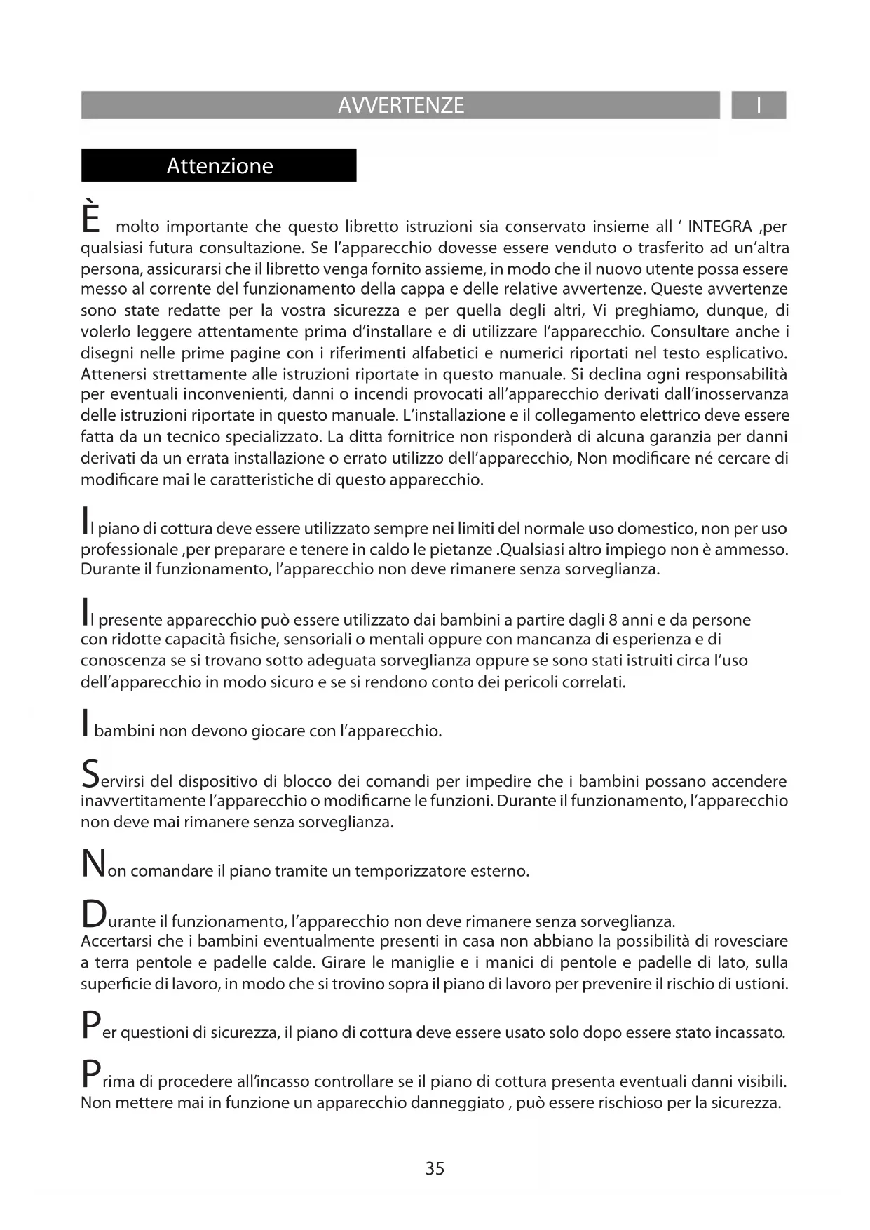 Attenzione È molto importante che questo libretto istruzioni sia conservato insieme all ‘ INTEGRA ,per qualsiasi futura consultazione. Se l’apparecchio dovesse essere venduto o trasferito ad un’altra persona, assicurarsi che il libretto venga fornito assieme, in modo che il nuovo utente possa essere messo al corrente del funzionamento della cappa e delle relative avvertenze. Queste avvertenze sono state redatte per la vostra sicurezza e per quella degli altri, Vi preghiamo, dunque, di volerlo leggere attentamente prima d’installare e di utilizzare l’apparecchio. Consultare anche i disegni nelle prime pagine con i riferimenti alfabetici e numerici riportati nel testo esplicativo. Attenersi strettamente alle istruzioni riportate in questo manuale. Si declina ogni responsabilità per eventuali inconvenienti, danni o incendi provocati all’apparecchio derivati dall’inosservanza delle istruzioni riportate in questo manuale. L’installazione e il collegamento elettrico deve essere fatta da un tecnico specializzato. La ditta fornitrice non risponderà di alcuna garanzia per danni derivati da un errata installazione o errato utilizzo dell’apparecchio, Non modicare né cercare di modicare mai le caratteristiche di questo apparecchio. Il piano di cottura deve essere utilizzato sempre nei limiti del normale uso domestico, non per uso professionale ,per preparare e tenere in caldo le pietanze .Qualsiasi altro impiego non è ammesso. Durante il funzionamento, l’apparecchio non deve rimanere senza sorveglianza. Il presente apparecchio può essere utilizzato dai bambini a partire dagli 8 anni e da persone con ridotte capacità siche, sensoriali o mentali oppure con mancanza di esperienza e di conoscenza se si trovano sotto adeguata sorveglianza oppure se sono stati istruiti circa l’uso dell’apparecchio in modo sicuro e se si rendono conto dei pericoli correlati. I bambini non devono giocare con l’apparecchio. Servirsi del dispositivo di blocco dei comandi per impedire che i bambini possano accendere inavvertitamente l’apparecchio o modicarne le funzioni. Durante il funzionamento, l’apparecchio non deve mai rimanere senza sorveglianza. Non comandare il piano tramite un temporizzatore esterno. Durante il funzionamento, l’apparecchio non deve rimanere senza sorveglianza. Accertarsi che i bambini eventualmente presenti in casa non abbiano la possibilità di rovesciare a terra pentole e padelle calde. Girare le maniglie e i manici di pentole e padelle di lato, sulla supercie di lavoro, in modo che si trovino sopra il piano di lavoro per prevenire il rischio di ustioni. Per questioni di sicurezza, il piano di cottura deve essere usato solo dopo essere stato incassato. Prima di procedere all’incasso controllare se il piano di cottura presenta eventuali danni visibili. Non mettere mai in funzione un apparecchio danneggiato , può essere rischioso per la sicurezza.36 AVVERTENZE