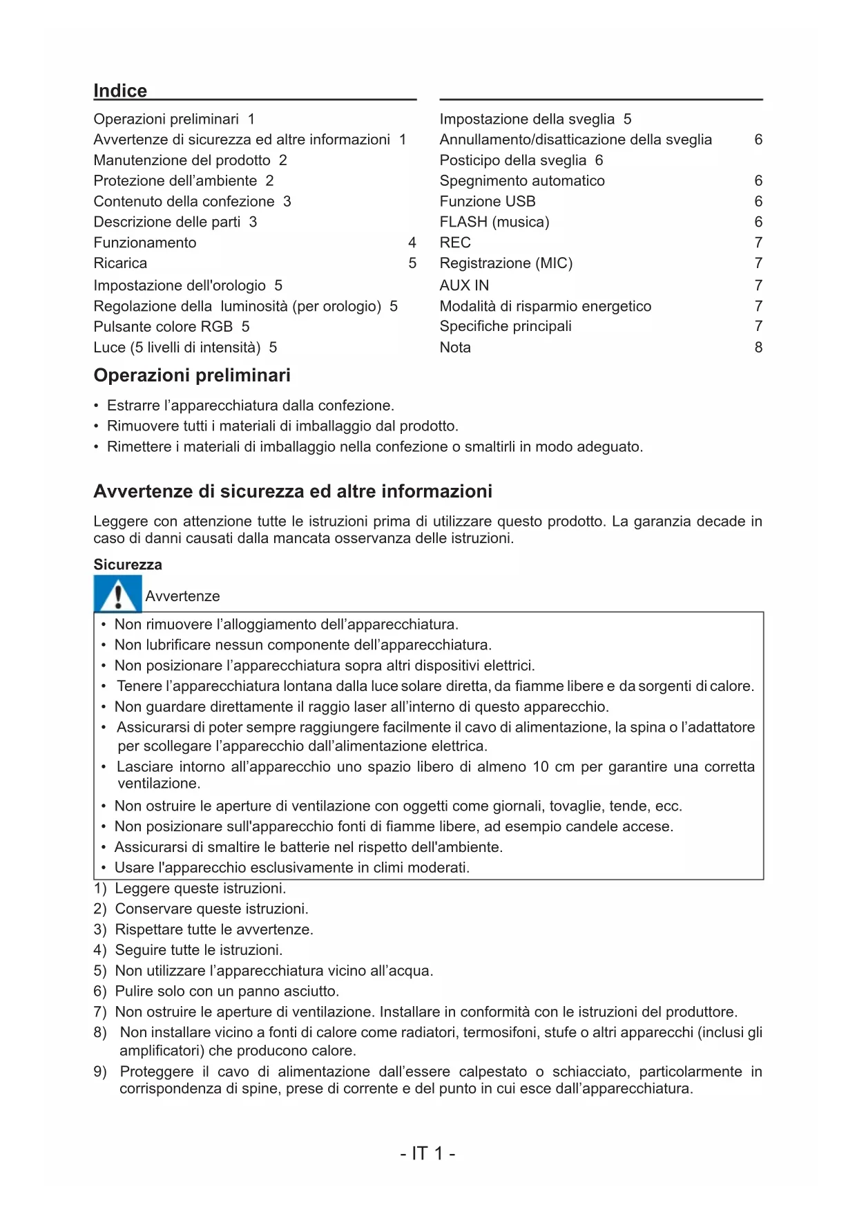 corrispondenza di spine, prese di corrente e del punto in cui esce dall’apparecchiatura. Operazioni preliminari 1 Avvertenze di sicurezza ed altre informazioni 1 Manutenzione del prodotto 2 Protezione dell’ambiente 2 Contenuto della confezione 3 Descrizione delle parti 3 Funzionamento 4 Ricarica 5 Impostazione dell'orologio 5 Regolazione della luminosità (per orologio) 5 Pulsante colore RGB 5 Luce (5 livelli di intensità) 5 Impostazione della sveglia 5 Annullamento/disatticazione della sveglia: 6 Posticipo della sveglia 6 Spegnimento automatico 6 Funzione USB 6 FLASH (musica) 6 REC: 7 Registrazione (MIC) 7 AUX IN 7 Modalità di risparmio energetico 7 Speciche principali 7 Nota: 8 Indice- IT 2 -