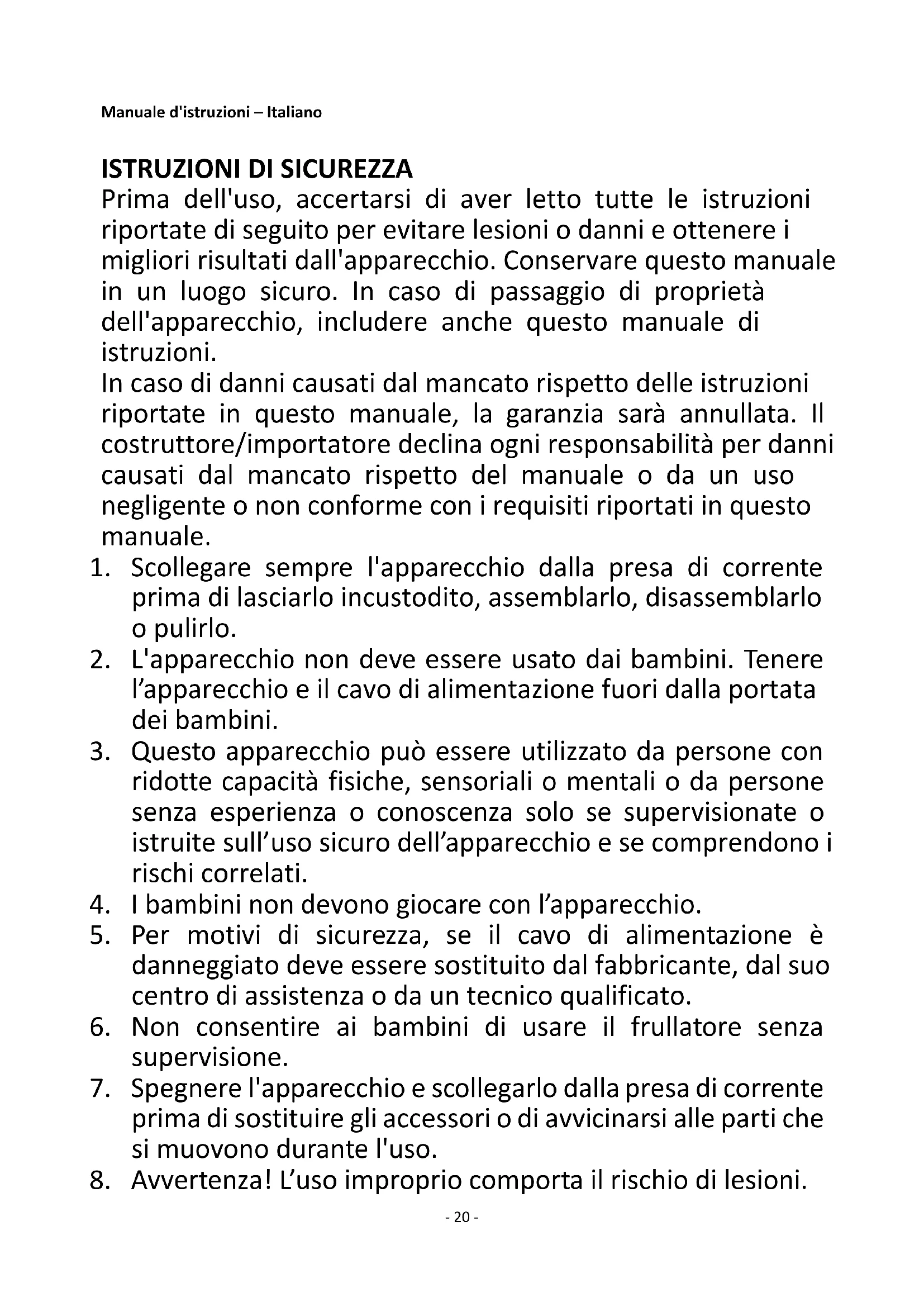 Prima dell'uso, accertarsi di aver letto tutte le istruzioni riportate di seguito per evitare lesioni o danni e ottenere i migliori risultati dall'apparecchio. Conservare questo manuale in un luogo sicuro. In caso di passaggio di proprietà dell'apparecchio, includere anche questo manuale di istruzioni. In caso di danni causati dal mancato rispetto delle istruzioni riportate in questo manuale, la garanzia sarà annullata. Il costruttore/importatore declina ogni responsabilità per danni causati dal mancato rispetto del manuale o da un uso negligente o non conforme con i requisiti riportati in questo manuale.