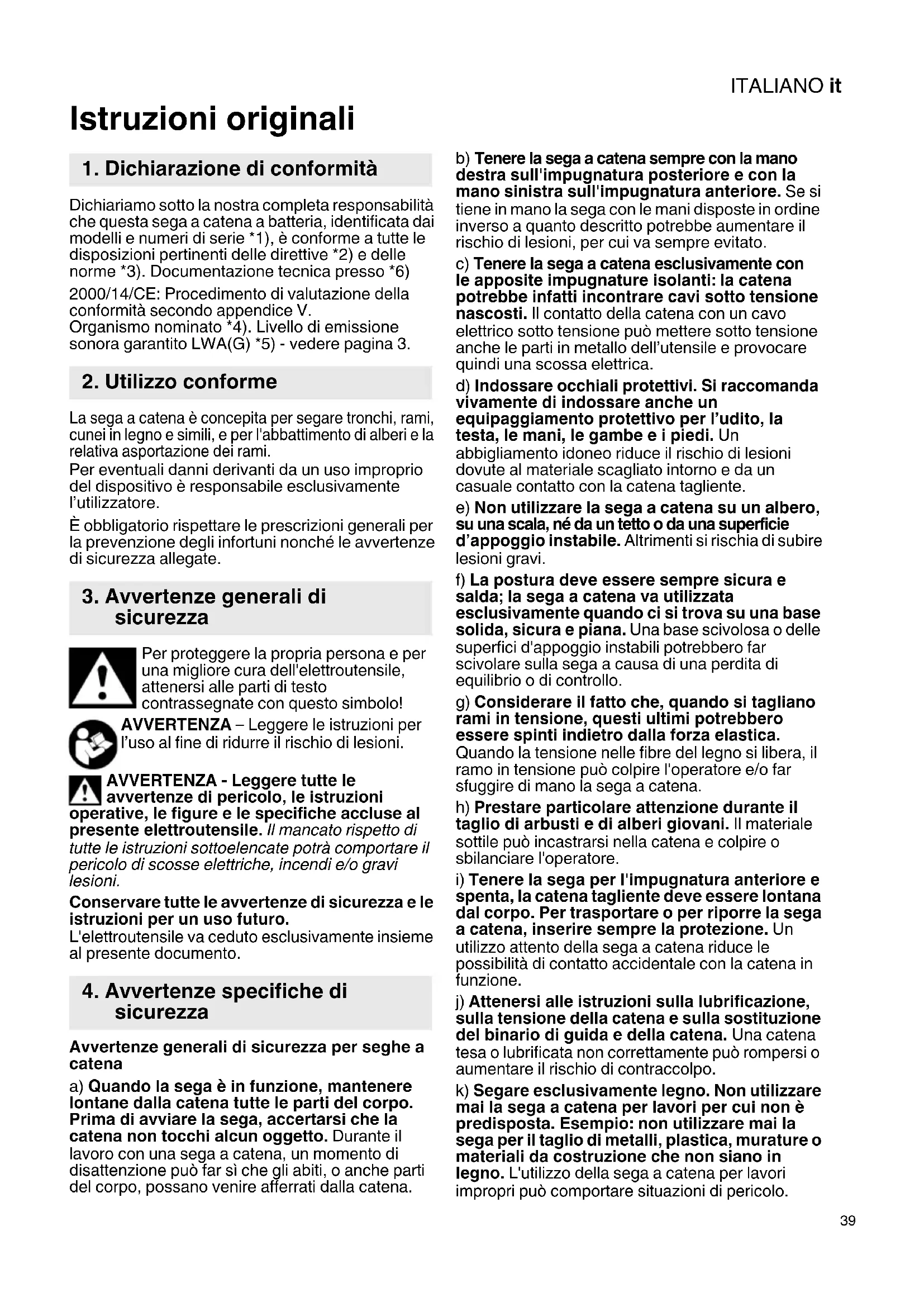 Istruzioni originali Dichiariamo sotto la nostra completa responsabilità che questa sega a catena a batteria, identificata dai modelli e numeri di serie *1), è conforme a tutte le disposizioni pertinenti delle direttive *2) e delle norme *3). Documentazione tecnica presso *6) 2000/14/CE: Procedimento di valutazione della conformità secondo appendice V. Organismo nominato *4). Livello di emissione sonora garantito LWA(G) *5) - vedere pagina 3. La sega a catena è concepita per segare tronchi, rami, cunei in legno e simili, e per l'abbattimento di alberi e la relativa asportazione dei rami. Per eventuali danni derivanti da un uso improprio del dispositivo è responsabile esclusivamente l’utilizzatore. È obbligatorio rispettare le prescrizioni generali per la prevenzione degli infortuni nonché le avvertenze di sicurezza allegate. Per proteggere la propria persona e per una migliore cura dell'elettroutensile, attenersi alle parti di testo contrassegnate con questo simbolo! AVVERTENZA – Leggere le istruzioni per l’uso al fine di ridurre il rischio di lesioni. AVVERTENZA - Leggere tutte le avvertenze di pericolo, le istruzioni operative, le figure e le specifiche accluse al presente elettroutensile. Il mancato rispetto di tutte le istruzioni sottoelencate potrà comportare il pericolo di scosse elettriche, incendi e/o gravi lesioni. Conservare tutte le avvertenze di sicurezza e le istruzioni per un uso futuro. L'elettroutensile va ceduto esclusivamente insieme al presente documento. Avvertenze generali di sicurezza per seghe a catena a) Quando la sega è in funzione, mantenere lontane dalla catena tutte le parti del corpo. Prima di avviare la sega, accertarsi che la catena non tocchi alcun oggetto. Durante il lavoro con una sega a catena, un momento di disattenzione può far sì che gli abiti, o anche parti del corpo, possano venire afferrati dalla catena. b) Tenere la sega a catena sempre con la mano destra sull'impugnatura posteriore e con la mano sinistra sull'impugnatura anteriore. Se si tiene in mano la sega con le mani disposte in ordine inverso a quanto descritto potrebbe aumentare il rischio di lesioni, per cui va sempre evitato. c) Tenere la sega a catena esclusivamente con le apposite impugnature isolanti: la catena potrebbe infatti incontrare cavi sotto tensione nascosti. Il contatto della catena con un cavo elettrico sotto tensione può mettere sotto tensione anche le parti in metallo dell’utensile e provocare quindi una scossa elettrica. d) Indossare occhiali protettivi. Si raccomanda vivamente di indossare anche un equipaggiamento protettivo per l’udito, la testa, le mani, le gambe e i piedi. Un abbigliamento idoneo riduce il rischio di lesioni dovute al materiale scagliato intorno e da un casuale contatto con la catena tagliente. e) Non utilizzare la sega a catena su un albero, su una scala, né da un tetto o da una superficie d’appoggio instabile. Altrimenti si rischia di subire lesioni gravi. f) La postura deve essere sempre sicura e salda; la sega a catena va utilizzata esclusivamente quando ci si trova su una base solida, sicura e piana. Una base scivolosa o delle superfici d'appoggio instabili potrebbero far scivolare sulla sega a causa di una perdita di equilibrio o di controllo. g) Considerare il fatto che, quando si tagliano rami in tensione, questi ultimi potrebbero essere spinti indietro dalla forza elastica. Quando la tensione nelle fibre del legno si libera, il ramo in tensione può colpire l'operatore e/o far sfuggire di mano la sega a catena. h) Prestare particolare attenzione durante il taglio di arbusti e di alberi giovani. Il materiale sottile può incastrarsi nella catena e colpire o sbilanciare l'operatore.