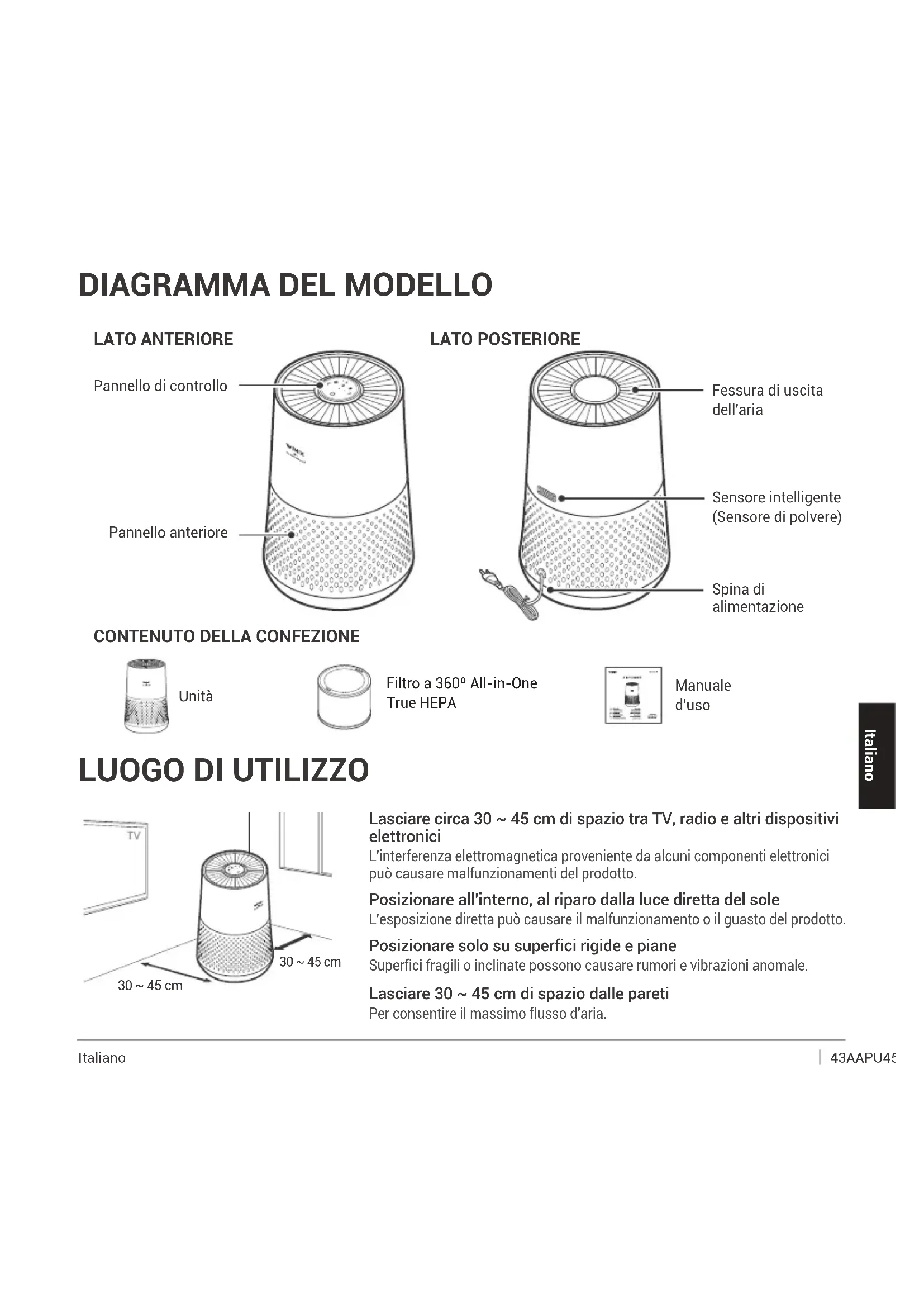 Pannello di controllo Fessura di uscita dell'aria Pannello anteriore Sensore intelligente (Sensore di polvere) Spina di alimentazione LATO POSTERIORE Unità Filtro a 360º All-in-One True HEPA Manuale d'uso 30 ~ 45 cm30 ~ 45 cm ItalianoItaliano Italiano