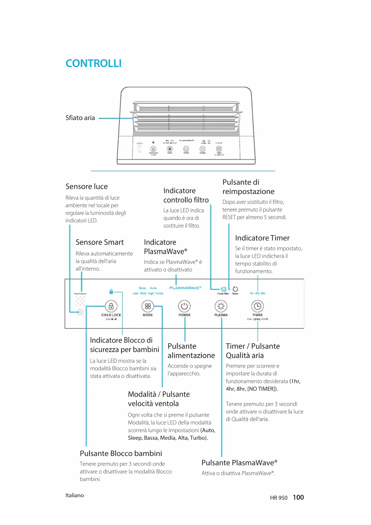 Italiano HR 950 Sfiato aria Sensore luce Rileva la quantità di luce ambiente nel locale per regolare la luminosità degli indicatori LED. Indicatore Timer Se il timer è stato impostato, la luce LED indicherà il tempo stabilito di funzionamento. Indicatore PlasmaWave® Indica se PlasmaWave® è attivato o disattivato Sensore Smart Rileva automaticamente la qualità dell'aria all'interno. Indicatore Blocco di sicurezza per bambini La luce LED mostra se la modalità Blocco bambini sia stata attivata o disattivata. Pulsante Blocco bambini Tenere premuto per 3 secondi onde attivare o disattivare la modalità Blocco bambini. Modalità / Pulsante velocità ventola Ogni volta che si preme il pulsante Modalità, la luce LED della modalità scorrerà lungo le impostazioni (Auto, Sleep, Bassa, Media, Alta, Turbo). Pulsante alimentazione Accende o spegne l'apparecchio. Timer / Pulsante Qualità aria Premere per scorrere e impostare la durata di funzionamento desiderata (1hr, 4hr, 8hr, [NO TIMER]). Tenere premuto per 3 secondi onde attivare o disattivare la luce di Qualità dell'aria. Pulsante PlasmaWave® Attiva o disattiva PlasmaWave®. Indicatore controllo filtro La luce LED indica quando è ora di sostituire il filtro. Pulsante di reimpostazione Dopo aver sostituito il filtro, tenere premuto il pulsante RESET per almeno 5 secondi. CONTROLLISetup | Installazione Italiano HR 950 AVVERTENZA Seguire le presenti istruzioni per ridurre il rischio di lesioni gravi o morte, oltre a quello di danneggiare l'apparecchio. DOVE UTILIZZARE Non utilizzare in caso di nebbie o fumi di oli industriali, o di grandi quantità di polveri metalliche.Non installare in alcun tipo di motore o veicolo di trasporto (camion, barche, navi, ecc.)Non collocare presso materiali infiammabili (aerosol, combustibili, gas, ecc.)Non collocare sotto prese elettricheNon collocare presso elementi riscaldantiNon collocare in aree con eccessiva presenza di gas nociviNon collocare l'apparecchio di fronte a vento o correnti d'ariaNon collocare in aree eccessivamente umide, dove l'apparecchio potrebbe bagnarsiLasciare 30 ~ 46 cm di spazio tra TV, radio e altri apparecchi elettroniciCollocare all'interno, lontano dalla luce diretta del solel'esposizione diretta può causare malfunzionamenti o guasti nel prodotto.Collocare esclusivamente su superfici rigide e piattesuperfici fragili o inclinate possono risultare in rumori e vibrazioni anomali. Il presente apparecchio non è progettato per la conservazione di documenti o di opere d'arte. l'interferenza elettromagnetica di alcuni dispositivi può causare malfunzionamenti nel prodotto. 30~46 cm 10 cm102 Installazione | Setup Italiano HR 950 3 Filtro HEPA vero antimicrobico 2 Filtro al carbone attivo CD 1 Prefiltro