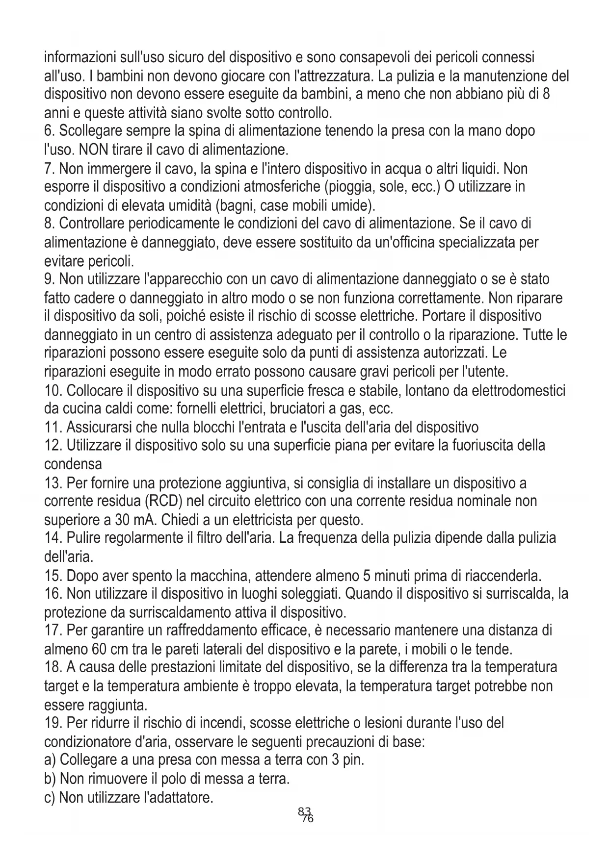 3. Se lo sporco è cospicuo, lavarlo con una soluzione di detersivo in acqua tiepida. Dopo averlo pulito, asciugarlo in un luogo ombreggiato e fresco, quindi reinstallarlo. Manutenzione dopo l'uso stagionale 1. Se il dispositivo non verrà utilizzato per un lungo periodo, assicurarsi di estrarre il tappo di gomma del foro di scarico (8) per scaricare l'acqua. 2. Tenere l'apparecchio in funzione in modalità ventola solo per mezza giornata durante una giornata di sole per asciugare l'interno dell'apparecchio ed evitare che si ammuffisca. 3. Arrestare il dispositivo ed estrarre la spina del cavo di alimentazione, quindi estrarre le batterie del telecomando e conservare il dispositivo correttamente.