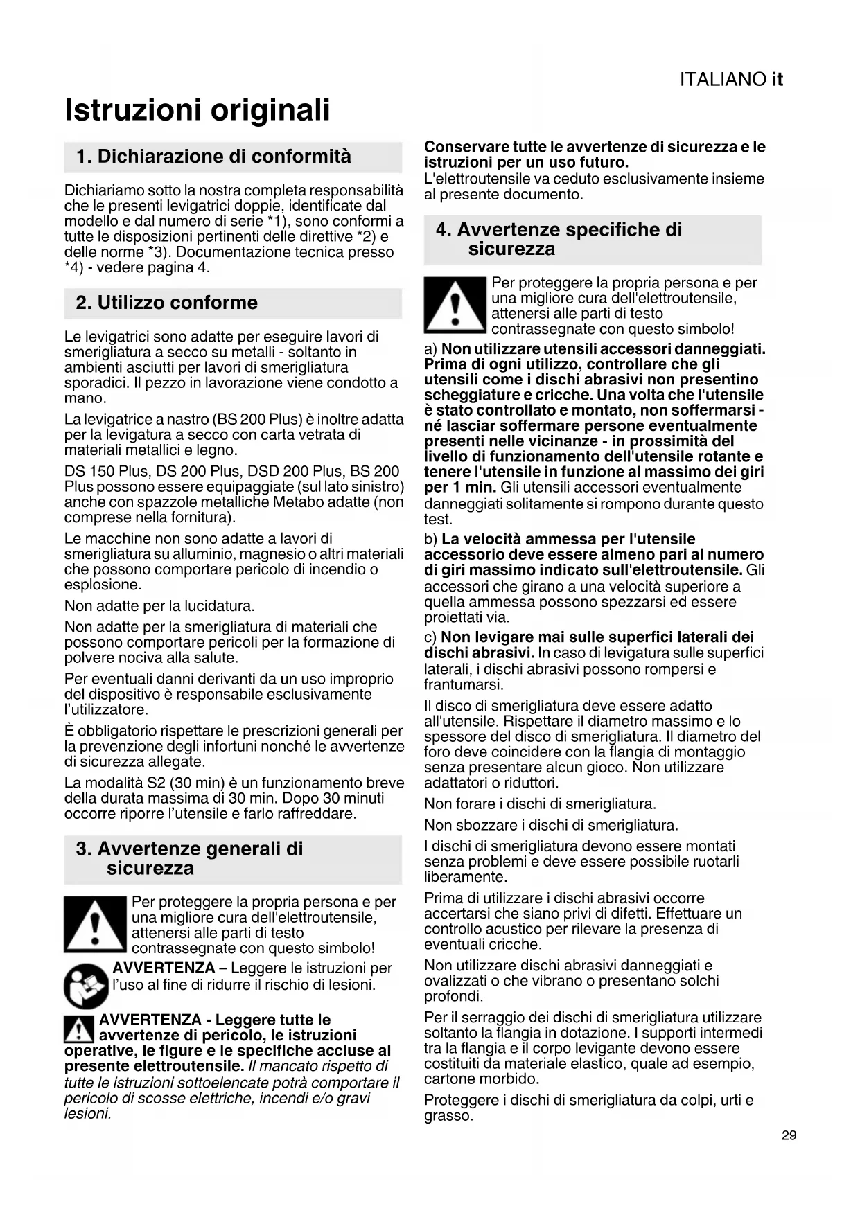 Istruzioni originali Dichiariamo sotto la nostra completa responsabilità che le presenti levigatrici doppie, identificate dal modello e dal numero di serie *1), sono conformi a tutte le disposizioni pertinenti delle direttive *2) e delle norme *3). Documentazione tecnica presso *4) - vedere pagina 4. Le levigatrici sono adatte per eseguire lavori di smerigliatura a secco su metalli - soltanto in ambienti asciutti per lavori di smerigliatura sporadici. Il pezzo in lavorazione viene condotto a mano. La levigatrice a nastro (BS 200 Plus) è inoltre adatta per la levigatura a secco con carta vetrata di materiali metallici e legno. DS 150 Plus, DS 200 Plus, DSD 200 Plus, BS 200 Plus possono essere equipaggiate (sul lato sinistro) anche con spazzole metalliche Metabo adatte (non comprese nella fornitura). Le macchine non sono adatte a lavori di smerigliatura su alluminio, magnesio o altri materiali che possono comportare pericolo di incendio o esplosione. Non adatte per la lucidatura. Non adatte per la smerigliatura di materiali che possono comportare pericoli per la formazione di polvere nociva alla salute. Per eventuali danni derivanti da un uso improprio del dispositivo è responsabile esclusivamente l’utilizzatore. È obbligatorio rispettare le prescrizioni generali per la prevenzione degli infortuni nonché le avvertenze di sicurezza allegate. La modalità S2 (30 min) è un funzionamento breve della durata massima di 30 min. Dopo 30 minuti occorre riporre l’utensile e farlo raffreddare. Per proteggere la propria persona e per una migliore cura dell'elettroutensile, attenersi alle parti di testo contrassegnate con questo simbolo! AVVERTENZA – Leggere le istruzioni per l’uso al fine di ridurre il rischio di lesioni. AVVERTENZA - Leggere tutte le avvertenze di pericolo, le istruzioni operative, le figure e le specifiche accluse al presente elettroutensile. Il mancato rispetto di tutte le istruzioni sottoelencate potrà comportare il pericolo di scosse elettriche, incendi e/o gravi lesioni. Conservare tutte le avvertenze di sicurezza e le istruzioni per un uso futuro. L'elettroutensile va ceduto esclusivamente insieme al presente documento. Per proteggere la propria persona e per una migliore cura dell'elettroutensile, attenersi alle parti di testo contrassegnate con questo simbolo! a) Non utilizzare utensili accessori danneggiati. Prima di ogni utilizzo, controllare che gli utensili come i dischi abrasivi non presentino scheggiature e cricche. Una volta che l'utensile è stato controllato e montato, non soffermarsi - né lasciar soffermare persone eventualmente presenti nelle vicinanze - in prossimità del livello di funzionamento dell'utensile rotante e tenere l'utensile in funzione al massimo dei giri per 1 min. Gli utensili accessori eventualmente danneggiati solitamente si rompono durante questo test. b) La velocità ammessa per l'utensile accessorio deve essere almeno pari al numero di giri massimo indicato sull'elettroutensile. Gli accessori che girano a una velocità superiore a quella ammessa possono spezzarsi ed essere proiettati via. c) Non levigare mai sulle superfici laterali dei dischi abrasivi. In caso di levigatura sulle superfici laterali, i dischi abrasivi possono rompersi e frantumarsi. Il disco di smerigliatura deve essere adatto all'utensile. Rispettare il diametro massimo e lo spessore del disco di smerigliatura. Il diametro del foro deve coincidere con la flangia di montaggio senza presentare alcun gioco. Non utilizzare adattatori o riduttori. Non forare i dischi di smerigliatura. Non sbozzare i dischi di smerigliatura. I dischi di smerigliatura devono essere montati senza problemi e deve essere possibile ruotarli liberamente. Prima di utilizzare i dischi abrasivi occorre accertarsi che siano privi di difetti. Effettuare un controllo acustico per rilevare la presenza di eventuali cricche. Non utilizzare dischi abrasivi danneggiati e ovalizzati o che vibrano o presentano solchi profondi. Per il serraggio dei dischi di smerigliatura utilizzare soltanto la flangia in dotazione. I supporti intermedi tra la flangia e il corpo levigante devono essere costituiti da materiale elastico, quale ad esempio, cartone morbido. Proteggere i dischi di smerigliatura da colpi, urti e grasso.