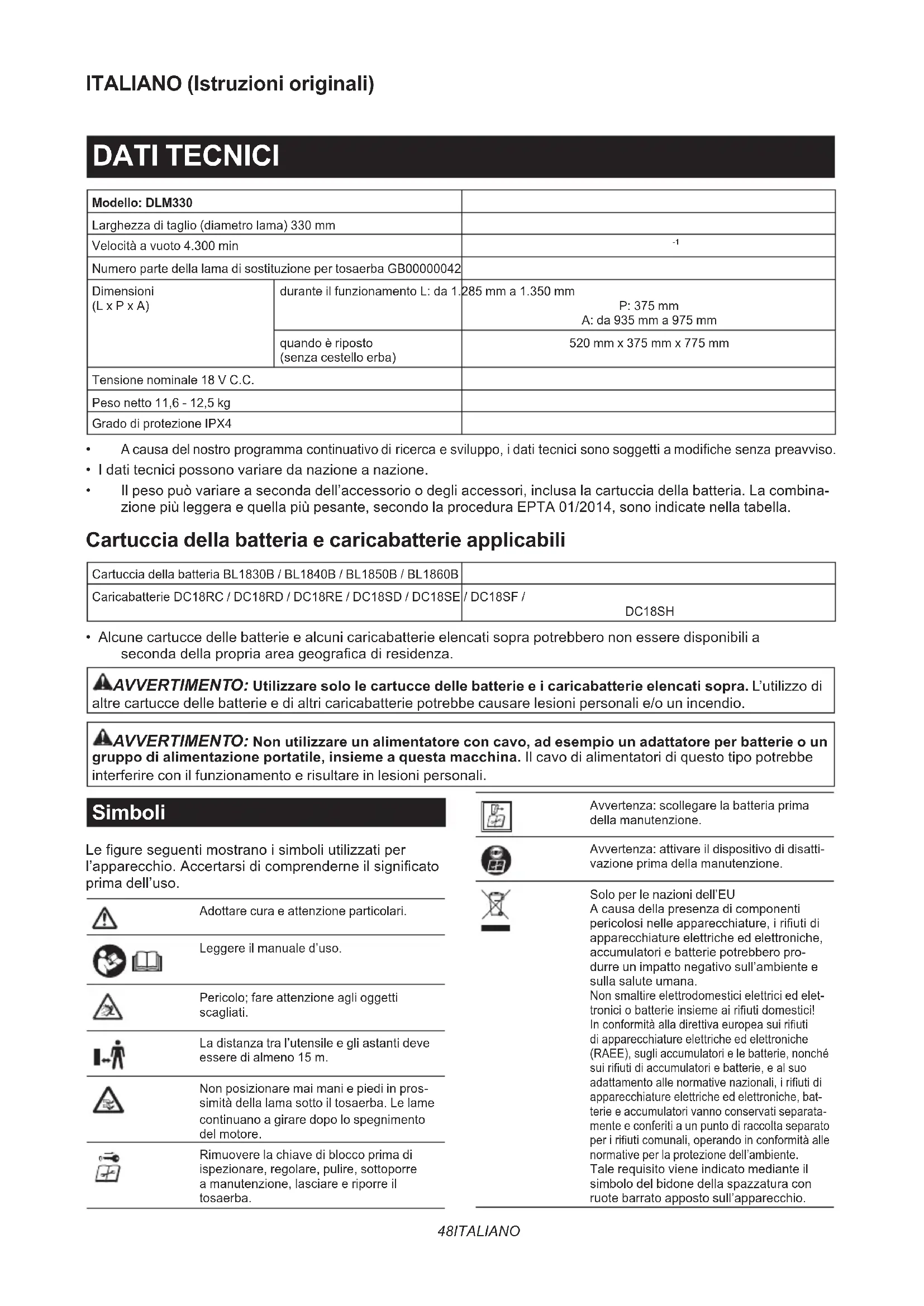 - Alcune cartucce delle batterie e alcuni caricabatterie elencati sopra potrebbero non essere disponibili a seconda della propria area geograca di residenza. AVVERTIMENTO: Utilizzare solo le cartucce delle batterie e i caricabatterie elencati sopra. L’utilizzo di altre cartucce delle batterie e di altri caricabatterie potrebbe causare lesioni personali e/o un incendio. AVVERTIMENTO: Non utilizzare un alimentatore con cavo, ad esempio un adattatore per batterie o un gruppo di alimentazione portatile, insieme a questa macchina. Il cavo di alimentatori di questo tipo potrebbe interferire con il funzionamento e risultare in lesioni personali. Simboli Le gure seguenti mostrano i simboli utilizzati per l’apparecchio. Accertarsi di comprenderne il signicato prima dell’uso. Adottare cura e attenzione particolari. Leggere il manuale d’uso. Pericolo; fare attenzione agli oggetti scagliati. La distanza tra l’utensile e gli astanti deve essere di almeno 15 m. Non posizionare mai mani e piedi in pros- simità della lama sotto il tosaerba. Le lame continuano a girare dopo lo spegnimento del motore. Rimuovere la chiave di blocco prima di ispezionare, regolare, pulire, sottoporre a manutenzione, lasciare e riporre il tosaerba. Avvertenza: scollegare la batteria prima della manutenzione. Avvertenza: attivare il dispositivo di disatti- vazione prima della manutenzione. Solo per le nazioni dell’EU A causa della presenza di componenti pericolosi nelle apparecchiature, i riuti di apparecchiature elettriche ed elettroniche, accumulatori e batterie potrebbero pro- durre un impatto negativo sull’ambiente e sulla salute umana. Non smaltire elettrodomestici elettrici ed elet- tronici o batterie insieme ai riuti domestici! In conformità alla direttiva europea sui riuti di apparecchiature elettriche ed elettroniche (RAEE), sugli accumulatori e le batterie, nonché sui riuti di accumulatori e batterie, e al suo adattamento alle normative nazionali, i riuti di apparecchiature elettriche ed elettroniche, bat- terie e accumulatori vanno conservati separata- mente e conferiti a un punto di raccolta separato per i riuti comunali, operando in conformità alle normative per la protezione dell’ambiente. Tale requisito viene indicato mediante il simbolo del bidone della spazzatura con ruote barrato apposto sull’apparecchio.49 ITALIANO