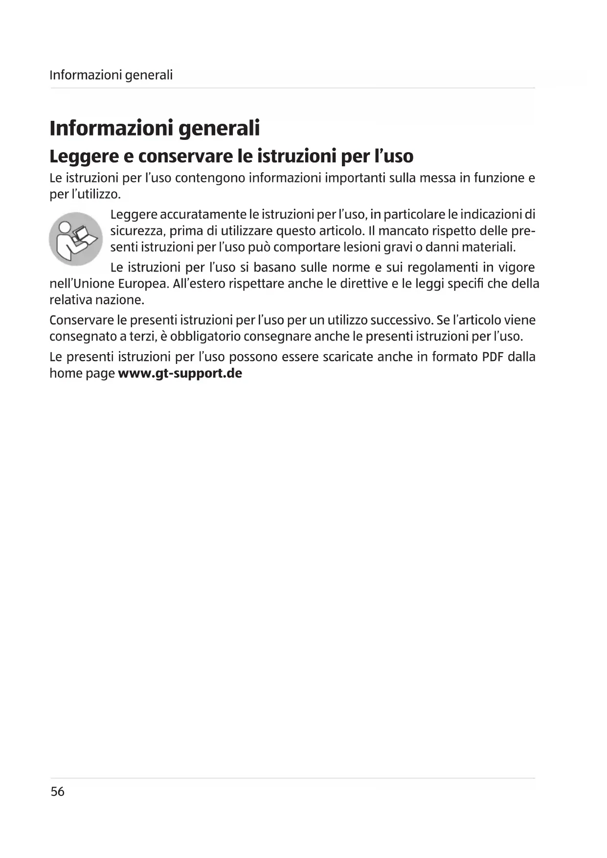o un altro componente gua- sto , vedi Indicazioni di sicurezza. − Estrarre la spina elettrica dalla presa elettrica. Non utilizzare ulteriormente l’apparecchio. Rivolgersi a un servizio di assistenza. Ricerca errori79 Dichiarazione di conformità Si garantisce la conformità del prodotto agli standard prescritti per legge. Per la di- chiarazione di conformità completa vedere in internet www.gt-support.de Smaltimento Smaltimento della confezione Smaltire la confezione in modo conforme. Il cartone e la carta devono essere conferiti con la carta da riciclare, le pellicole nella raccolta apposita. Smaltimento dell’apparecchio (Applicazione nell’Unione Europea e in altri Stati europei con sistemi per la raccolta differenziata dei materiali) Non smaltire gli apparecchi con i rifi uti domestici! Se l’apparecchio non può più essere utilizzato, ogni consumatore ha l’obbligo per legge di conferire gli apparecchi separatamente dai rifi uti domestici, ad es. pres- so il centro di raccolta del proprio comune o del quartiere. In questo modo si assicura un riciclaggio conforme delle apparecchiature evitando effetti negativi sull’ambiente. Per questo motivo gli apparecchi elettrici sono contrassegnati con il simbolo sopra ri- prodotto. Dichiarazione di conformità/SmaltimentoVertrieben durch: | Commercialisé par : | Commercializzato da: