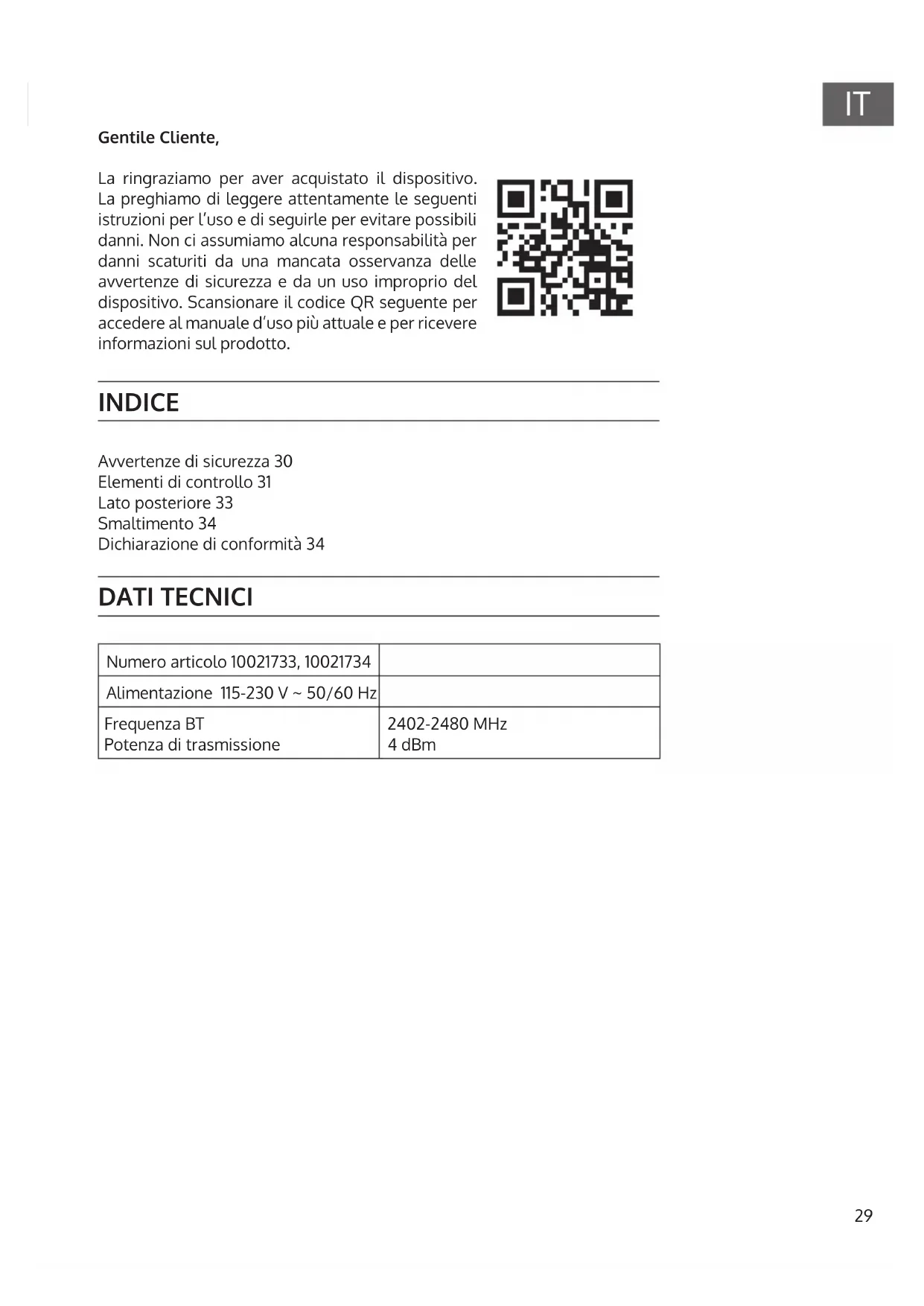 Gentile Cliente, La ringraziamo per aver acquistato il dispositivo. La preghiamo di leggere attentamente le seguenti istruzioni per l’uso e di seguirle per evitare possibili danni. Non ci assumiamo alcuna responsabilità per danni scaturiti da una mancata osservanza delle avvertenze di sicurezza e da un uso improprio del dispositivo. Scansionare il codice QR seguente per accedere al manuale d’uso più attuale e per ricevere informazioni sul prodotto. INDICE DATI TECNICI Numero articolo 10021733, 10021734 Alimentazione 115-230 V ~ 50/60 Hz Frequenza BT Potenza di trasmissione 2402-2480 MHz 4 dBm Avvertenze di sicurezza 30 Elementi di controllo 31 Lato posteriore 33 Smaltimento 34 Dichiarazione di conformità 3430