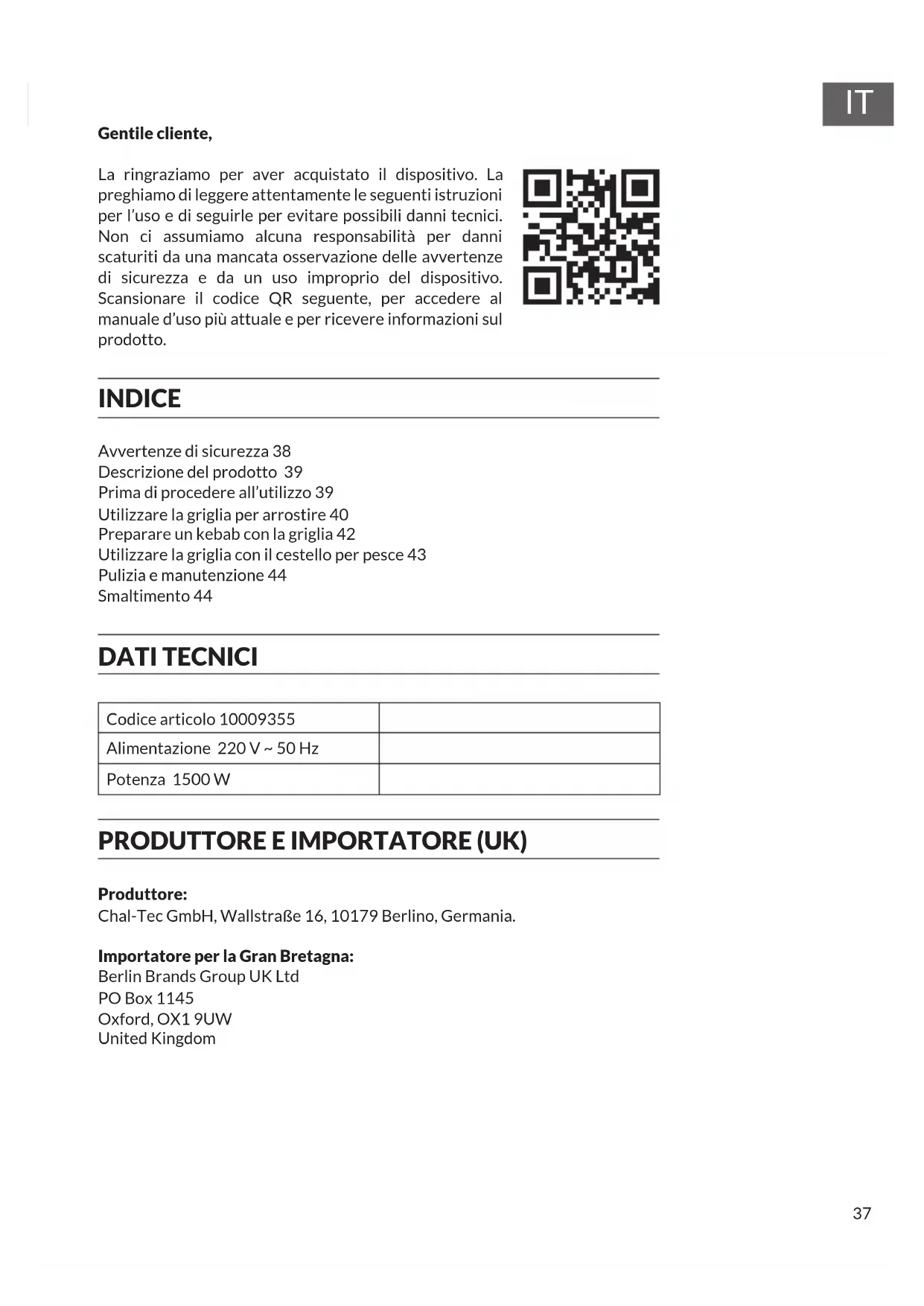 Gentile cliente, La ringraziamo per aver acquistato il dispositivo. La preghiamo di leggere attentamente le seguenti istruzioni per l’uso e di seguirle per evitare possibili danni tecnici. Non ci assumiamo alcuna responsabilità per danni scaturiti da una mancata osservazione delle avvertenze di sicurezza e da un uso improprio del dispositivo. Scansionare il codice QR seguente, per accedere al manuale d’uso più attuale e per ricevere informazioni sul prodotto. INDICE Avvertenze di sicurezza 38 Descrizione del prodotto 39 Prima di procedere all’utilizzo 39 Utilizzare la griglia per arrostire 40 Preparare un kebab con la griglia 42 Utilizzare la griglia con il cestello per pesce 43 Pulizia e manutenzione 44 Smaltimento 44 DATI TECNICI Codice articolo 10009355 Alimentazione 220 V ~ 50 Hz Potenza 1500 W PRODUTTORE E IMPORTATORE (UK) Produttore: Chal-Tec GmbH, Wallstraße 16, 10179 Berlino, Germania. Importatore per la Gran Bretagna: Berlin Brands Group UK Ltd PO Box 1145 Oxford, OX1 9UW United Kingdom38