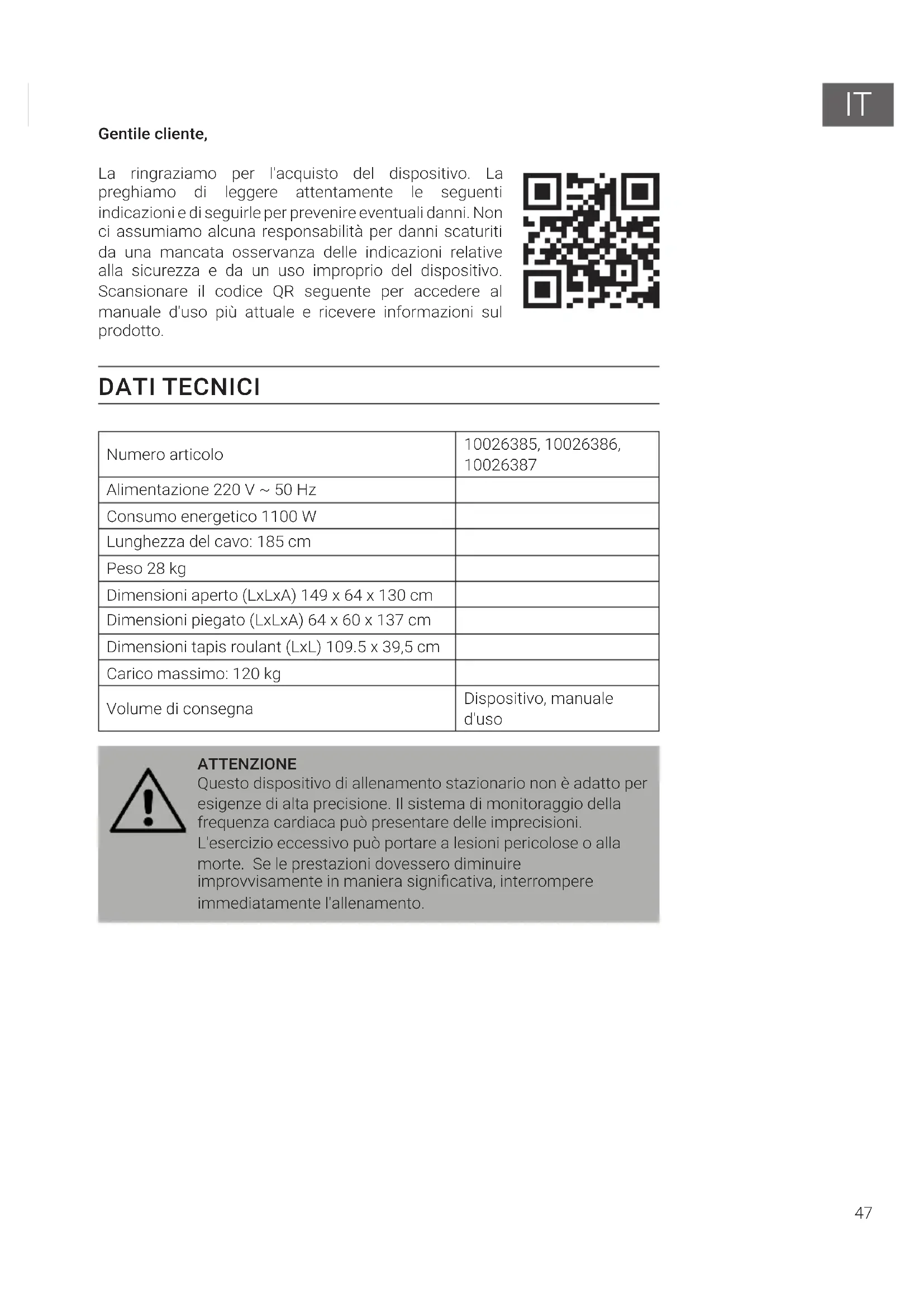Alimentazione 220 V ~ 50 Hz Consumo energetico 1100 W Lunghezza del cavo: 185 cm Peso 28 kg Dimensioni aperto (LxLxA) 149 x 64 x 130 cm Dimensioni piegato (LxLxA) 64 x 60 x 137 cm Dimensioni tapis roulant (LxL) 109.5 x 39,5 cm Carico massimo: 120 kg Volume di consegna Dispositivo, manuale d'uso ATTENZIONE Questo dispositivo di allenamento stazionario non è adatto per esigenze di alta precisione. Il sistema di monitoraggio della frequenza cardiaca può presentare delle imprecisioni. L'esercizio eccessivo può portare a lesioni pericolose o alla morte. Se le prestazioni dovessero diminuire improvvisamente in maniera signicativa, interrompere immediatamente l'allenamento.48