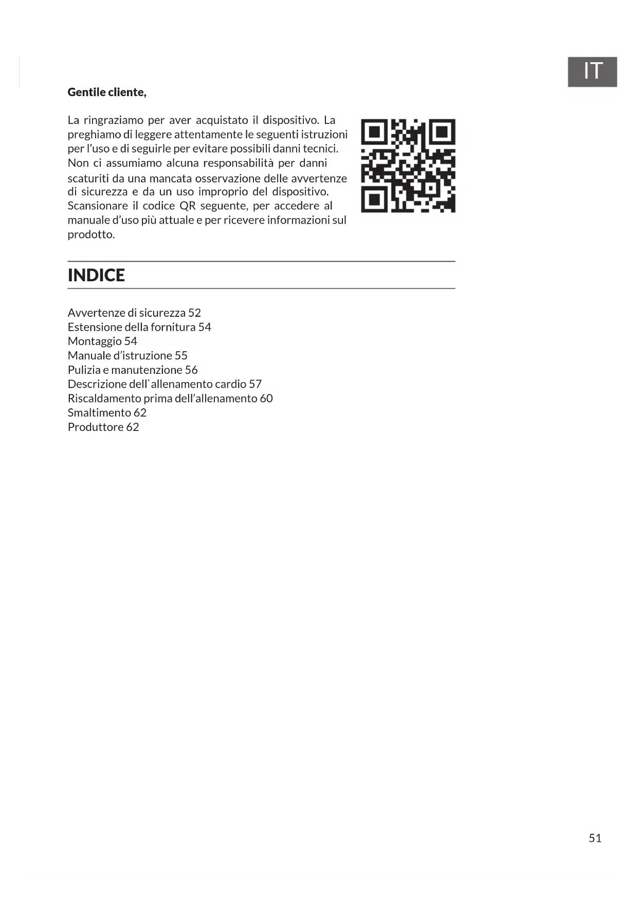 Gentile cliente, La ringraziamo per aver acquistato il dispositivo. La preghiamo di leggere attentamente le seguenti istruzioni per l’uso e di seguirle per evitare possibili danni tecnici. Non ci assumiamo alcuna responsabilità per danni scaturiti da una mancata osservazione delle avvertenze di sicurezza e da un uso improprio del dispositivo. Scansionare il codice QR seguente, per accedere al manuale d’uso più attuale e per ricevere informazioni sul prodotto. INDICE Avvertenze di sicurezza 52 Estensione della fornitura 54 Montaggio 54 Manuale d’istruzione 55 Pulizia e manutenzione 56 Descrizione dell`allenamento cardio 57 Riscaldamento prima dell’allenamento 60 Smaltimento 62 Produttore 6252