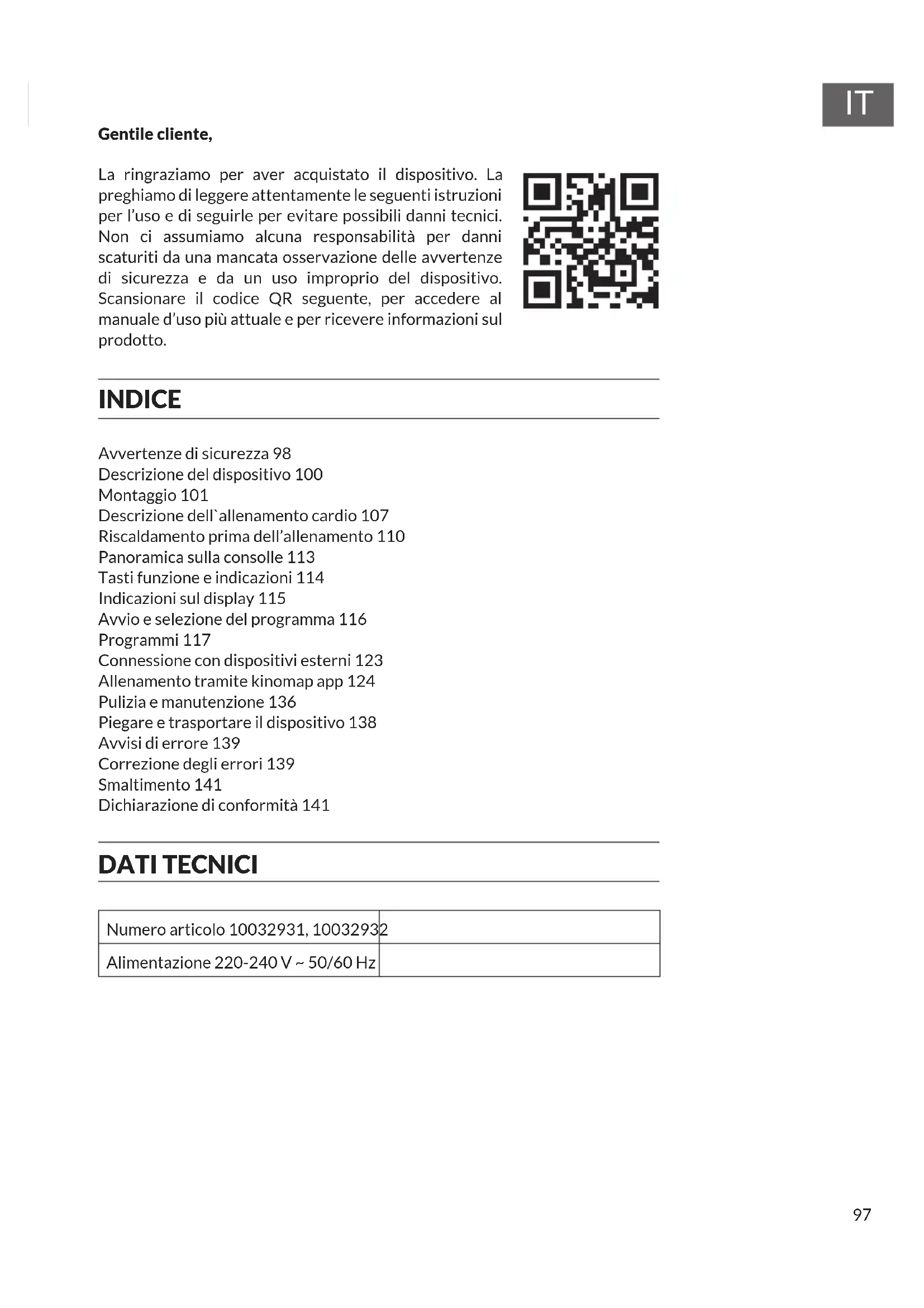 Gentile cliente, La ringraziamo per aver acquistato il dispositivo. La preghiamo di leggere attentamente le seguenti istruzioni per l’uso e di seguirle per evitare possibili danni tecnici. Non ci assumiamo alcuna responsabilità per danni scaturiti da una mancata osservazione delle avvertenze di sicurezza e da un uso improprio del dispositivo. Scansionare il codice QR seguente, per accedere al manuale d’uso più attuale e per ricevere informazioni sul prodotto. INDICE Avvertenze di sicurezza 98 Descrizione del dispositivo 100 Montaggio 101 Descrizione dell`allenamento cardio 107 Riscaldamento prima dell’allenamento 110 Panoramica sulla consolle 113 Tasti funzione e indicazioni 114 Indicazioni sul display 115 Avvio e selezione del programma 116 Programmi 117 Connessione con dispositivi esterni 123 Allenamento tramite kinomap app 124 Pulizia e manutenzione 136 Piegare e trasportare il dispositivo 138 Avvisi di errore 139 Correzione degli errori 139 Smaltimento 141 Dichiarazione di conformità 141 DATI TECNICI Numero articolo 10032931, 10032932 Alimentazione 220-240 V ~ 50/60 Hz98